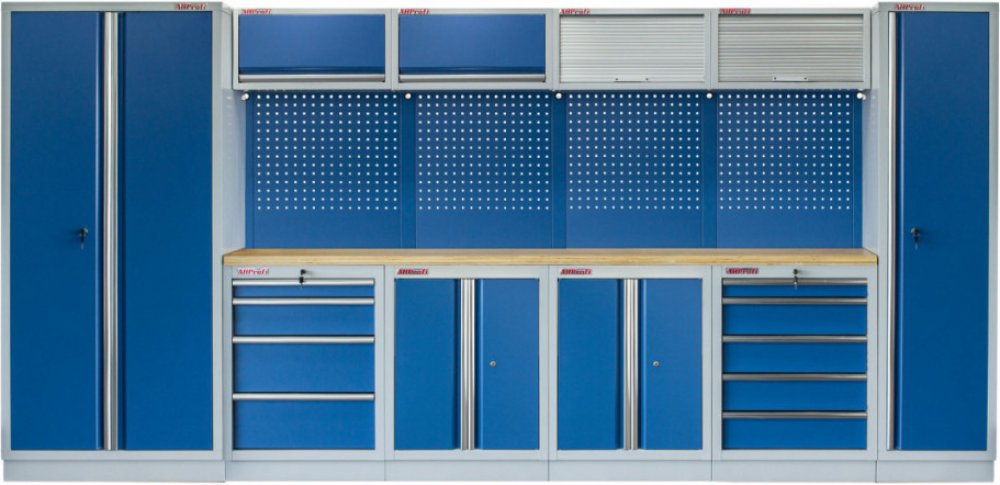 Sestava nábytku v sobě skrývá dostatečné množství úložného prostoru pro vaše nářadí, autotechniku i dílenské vybavení. V kombinaci s bytelnou pracovní deskou získáte multifunkční stěnu, se kterou vám půjde práce od ruky ve všech směrech.