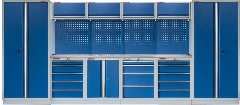 Sestava nábytku v sobě skrývá dostatečné množství úložného prostoru pro vaše nářadí, autotechniku i dílenské vybavení. V kombinaci s bytelnou pracovní deskou získáte multifunkční stěnu, se kterou vám půjde práce od ruky ve všech směrech.