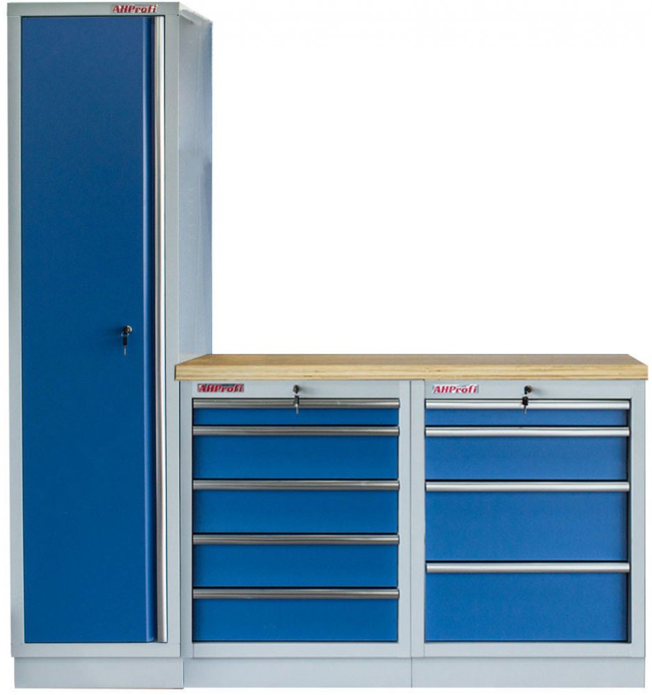 Dílenský nábytek PROFI BLUE s dřevěnou deskou zaujme moderním a profesionálním vzhledem. Kombinace modré RAL 5023 a šedé RAL 7035 barvy se bude vyjímat v každé garáži i dílně.