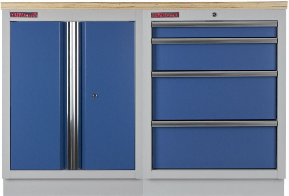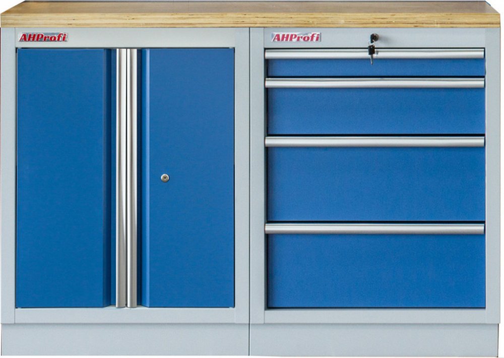 Dílenský nábytek PROFI BLUE s dřevěnou deskou zaujme moderním a profesionálním vzhledem. Kombinace modré RAL 5023 a šedé RAL 7035 barvy se bude vyjímat v každé garáži i dílně.