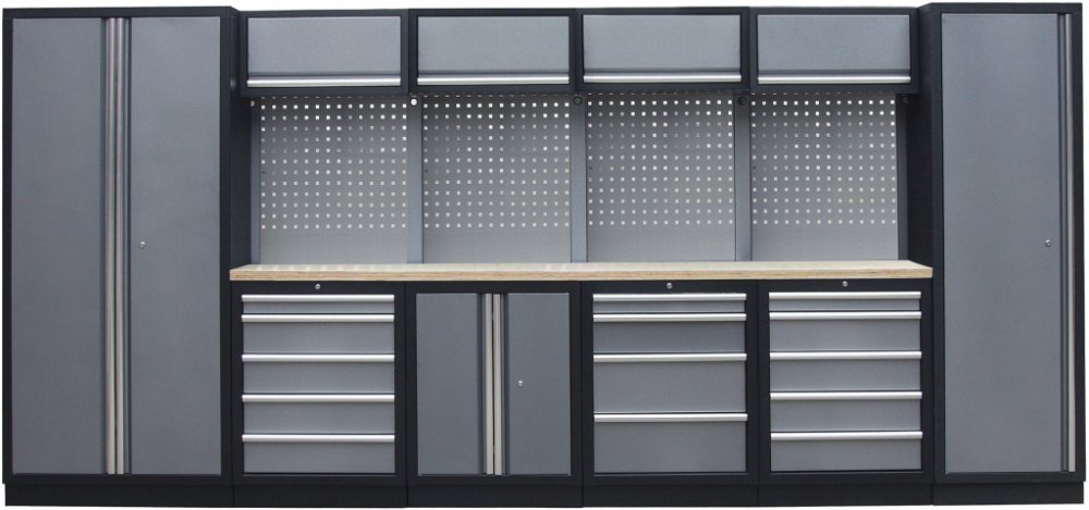 Sestava nábytku v sobě skrývá dostatečné množství úložného prostoru pro vaše nářadí, autotechniku i dílenské vybavení. V kombinaci s bytelnou pracovní deskou získáte multifunkční stěnu, se kterou vám půjde práce od ruky ve všech směrech.