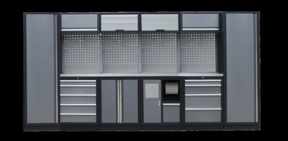 Sestava nábytku v sobě skrývá dostatečné množství úložného prostoru pro vaše nářadí, autotechniku i dílenské vybavení. V kombinaci s bytelnou pracovní deskou získáte multifunkční stěnu, se kterou vám půjde práce od ruky ve všech směrech.