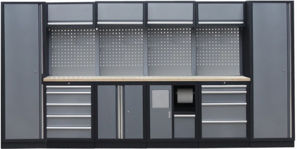 Sestava nábytku v sobě skrývá dostatečné množství úložného prostoru pro vaše nářadí, autotechniku i dílenské vybavení. V kombinaci s bytelnou pracovní deskou získáte multifunkční stěnu, se kterou vám půjde práce od ruky ve všech směrech.