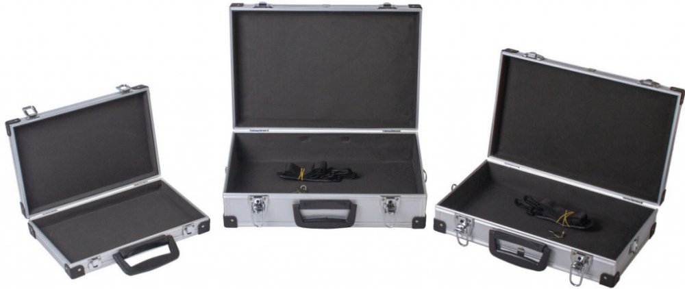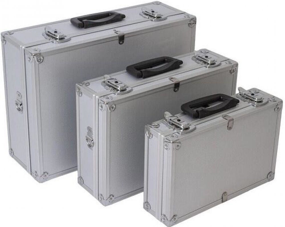 Sada tří hliníkových kufrů, které lze uskladnit do sebe. Kufry jsou lehce přenosné díky madlům. Ke dvou větším kufrům lze připnout popruh na ramena.