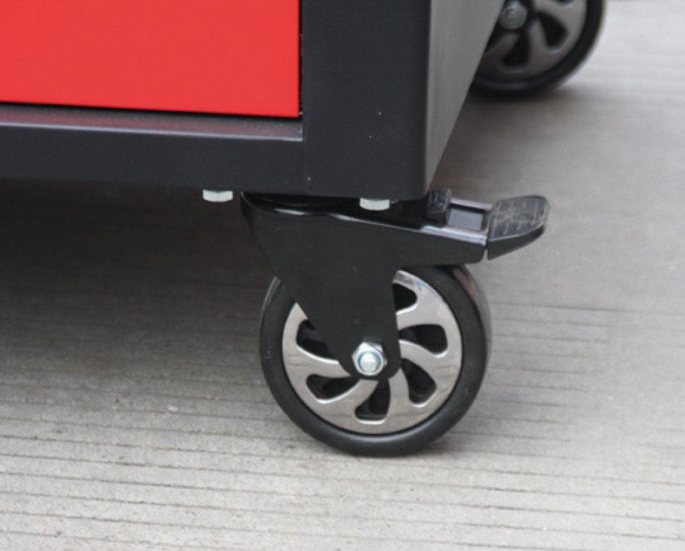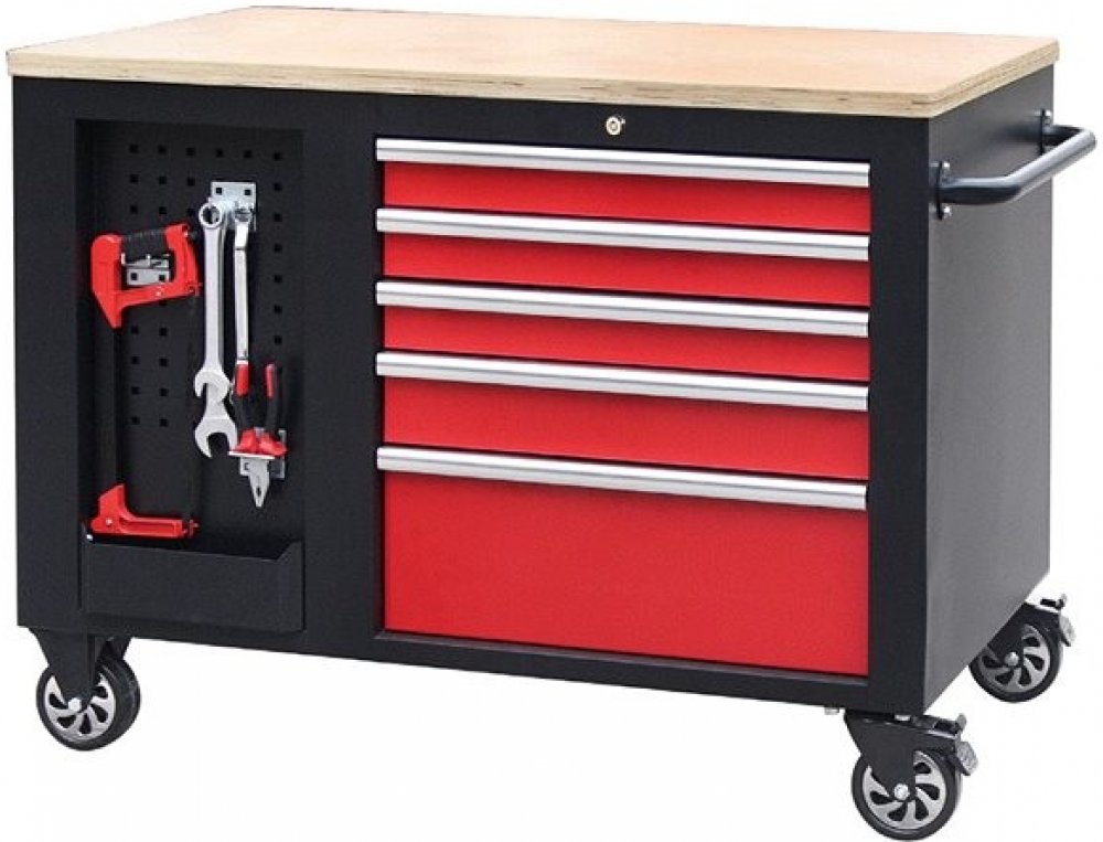 Černo-červený velký dílenský vozík s 10-ti zásuvkami o rozměrech (š x h x v): 1141 x 730 x 888 mm. Vozík je zamykatelný, má 2 pevná a 2 otočná pogumovaná kolečka a je doslova všestranný. Uskladňovací prostory má ze všech stran!