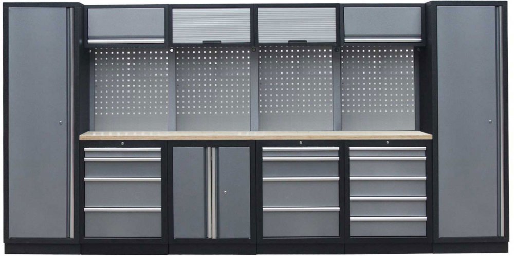 Sestava nábytku v sobě skrývá dostatečné množství úložného prostoru pro vaše nářadí, autotechniku i dílenské vybavení. V kombinaci s bytelnou pracovní deskou získáte multifunkční stěnu, se kterou vám půjde práce od ruky ve všech směrech.