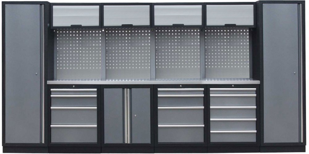 Sestava nábytku v sobě skrývá dostatečné množství úložného prostoru pro vaše nářadí, autotechniku i dílenské vybavení. V kombinaci s bytelnou pracovní deskou získáte multifunkční stěnu, se kterou vám půjde práce od ruky ve všech směrech.