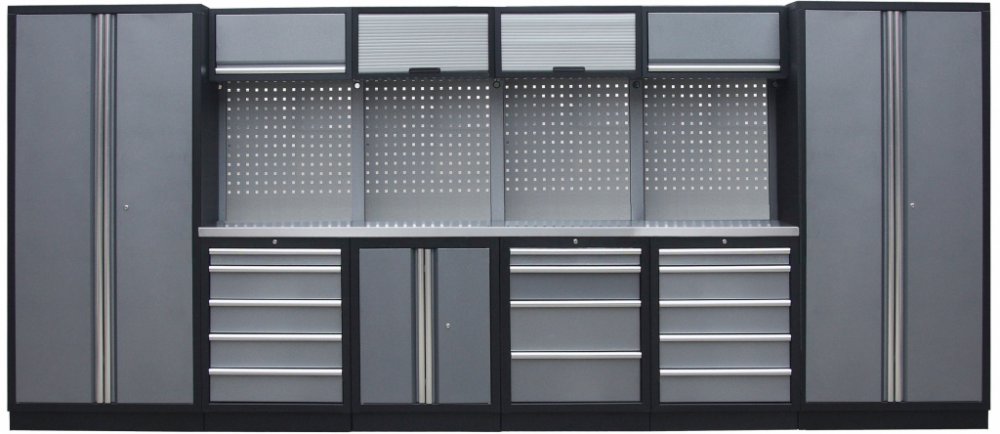 Sestava nábytku v sobě skrývá dostatečné množství úložného prostoru pro vaše nářadí, autotechniku i dílenské vybavení. V kombinaci s bytelnou pracovní deskou získáte multifunkční stěnu, se kterou vám půjde práce od ruky ve všech směrech.