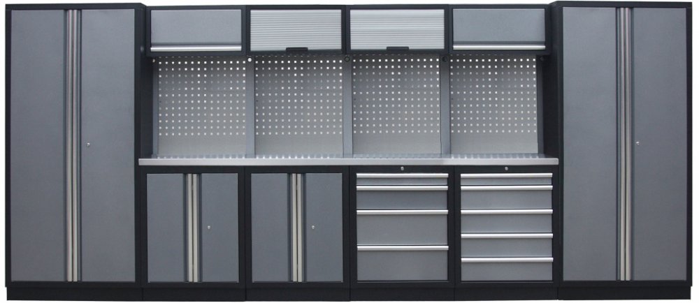 Sestava nábytku v sobě skrývá dostatečné množství úložného prostoru pro vaše nářadí, autotechniku i dílenské vybavení. V kombinaci s bytelnou pracovní deskou získáte multifunkční stěnu, se kterou vám půjde práce od ruky ve všech směrech.