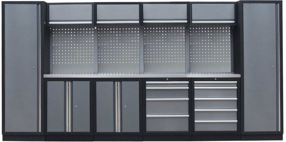 Sestava nábytku v sobě skrývá dostatečné množství úložného prostoru pro vaše nářadí, autotechniku i dílenské vybavení. V kombinaci s bytelnou pracovní deskou získáte multifunkční stěnu, se kterou vám půjde práce od ruky ve všech směrech.