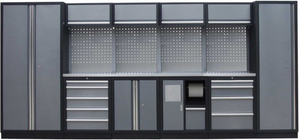 Sestava dílenského nábytku ve vysoké kvalitě, který je vhodný pro profesionální servisy i domácí garáže a dílny. Nábytek je celokovový s kovovou pracovní deskou. Sestava 21 ks dílenského nábytku udrží nářadí přehledně uklizené na správném místě.
