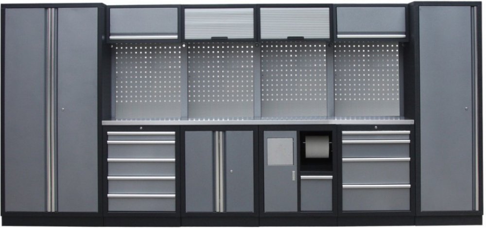 Sestava dílenského nábytku ve vysoké kvalitě, který je vhodný pro profesionální servisy i domácí garáže a dílny. Nábytek je celokovový s kovovou pracovní deskou. Sestava 21 ks dílenského nábytku udrží nářadí přehledně uklizené na správném místě.
