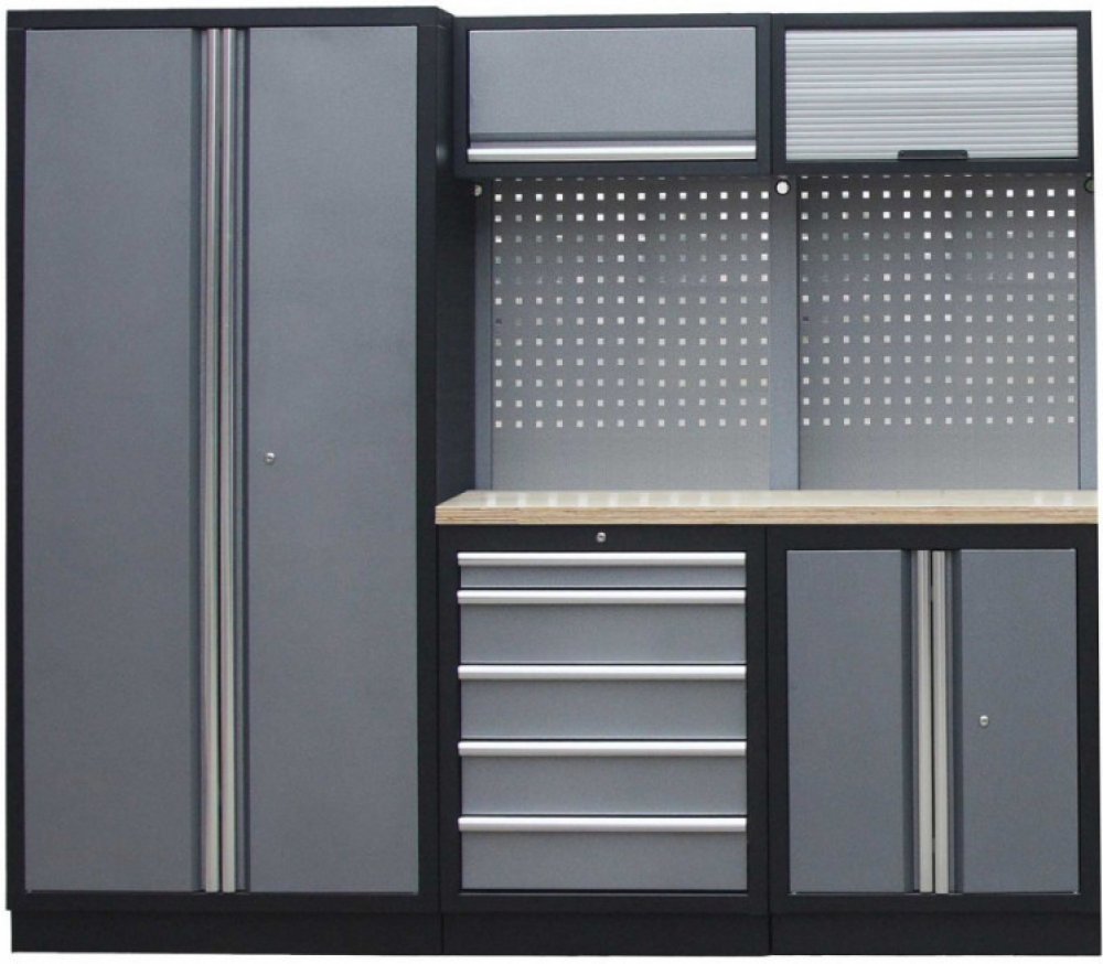 Sestava nábytku v sobě skrývá dostatečné množství úložného prostoru pro vaše nářadí, autotechniku i dílenské vybavení. V kombinaci s bytelnou pracovní deskou získáte multifunkční stěnu, se kterou vám půjde práce od ruky ve všech směrech.