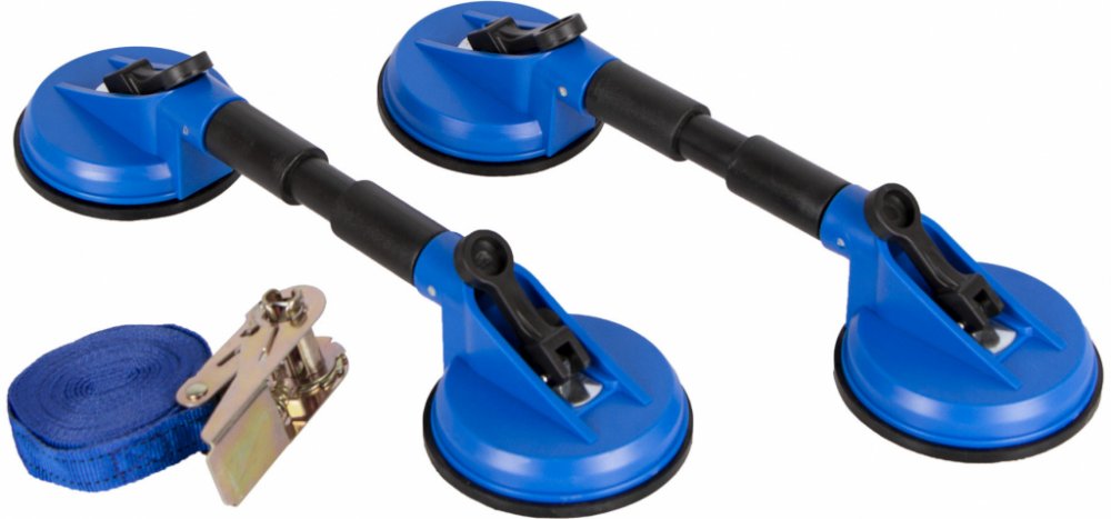 Sada 2 přísavek a 1 kurtu s ráčnou pro přenos skel a především k pevnému upevnění skla do rámu při jeho lepení/instalaci. Přísavky ponecháte upevněné na skle a přes ně přiložíte kurt, který napnete přes rám. Tím sklo, i když je vypouklé, pevně přilne do rámu a lepidlo a těsnění mají tak dostatek času na adaptaci.