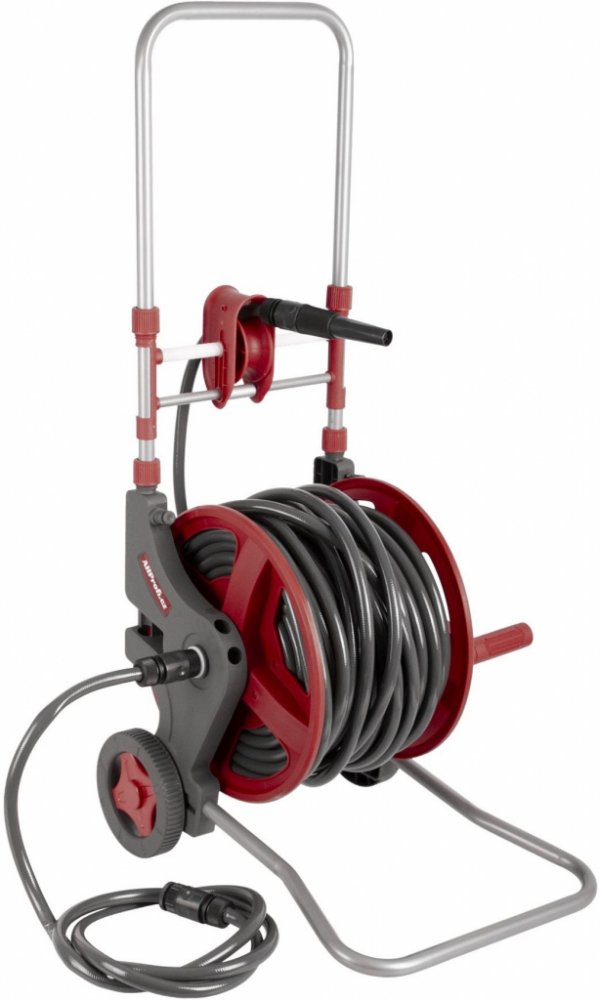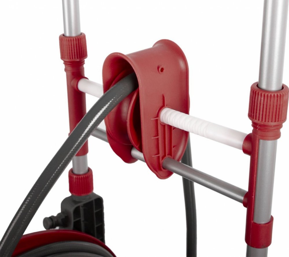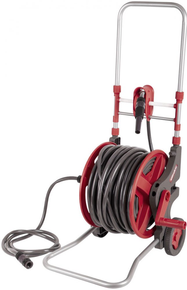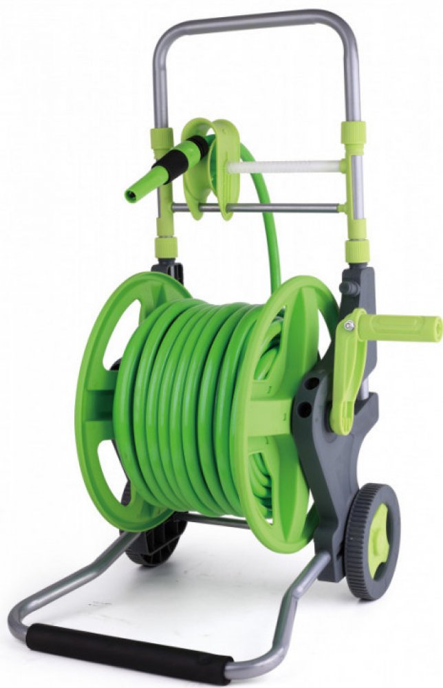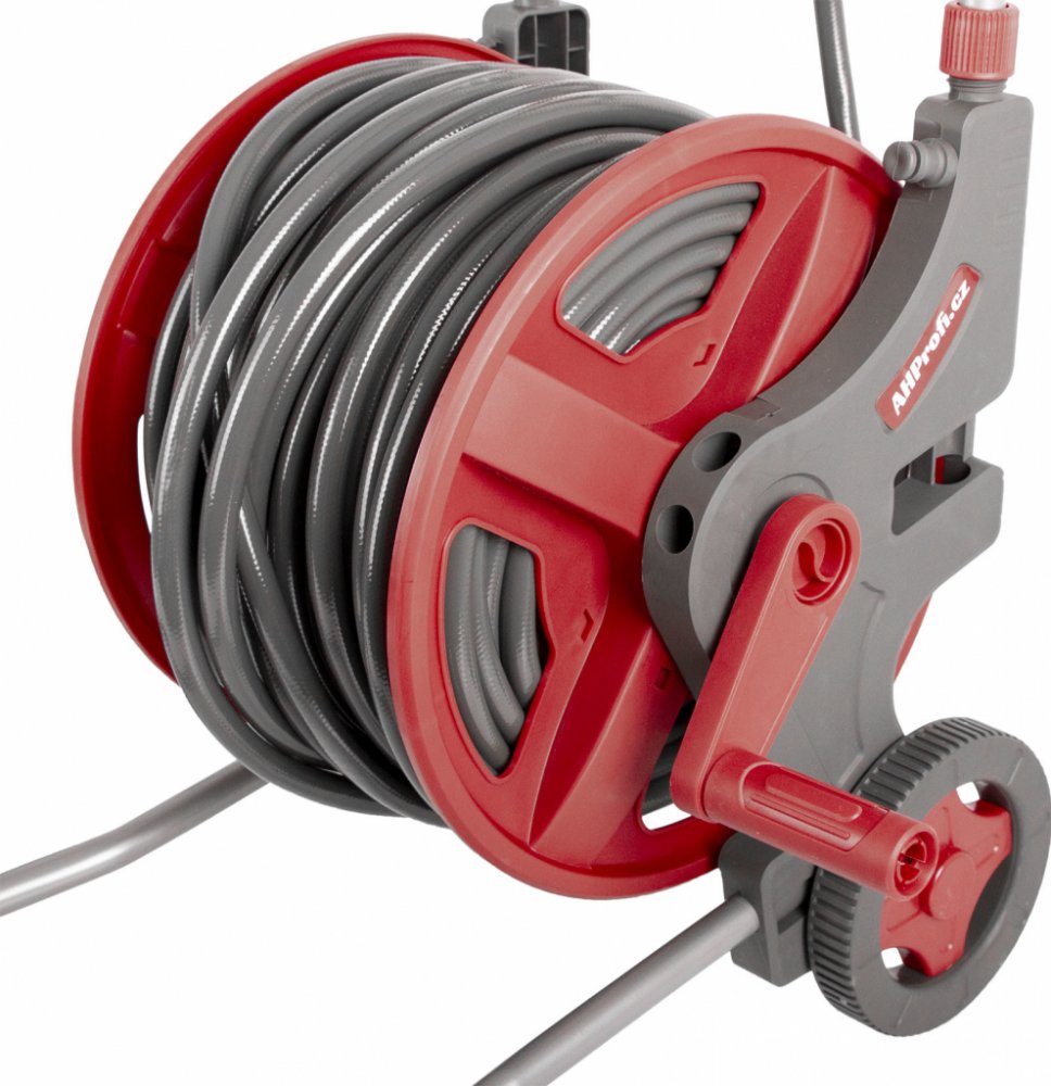 Vozík na zahradní hadici Vám poslouží u dílny, garáže i na zahradě pro snadnou dopravu i uskladnění zahradních hadic. Ušetřete místo i čas při skladování hadice - hadici snadno vytáhnete z bubnu a následně za pomoci kliky navinete.