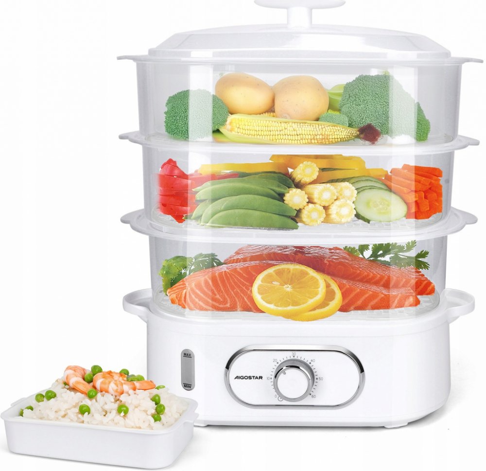 Elektrický parník Aigostar s velkým objemem 12L. Díky 60minutovému časovači můžete vařit více pokrmů najednou, jako je zelenina, maso, ryby, rýže, polévka atd.