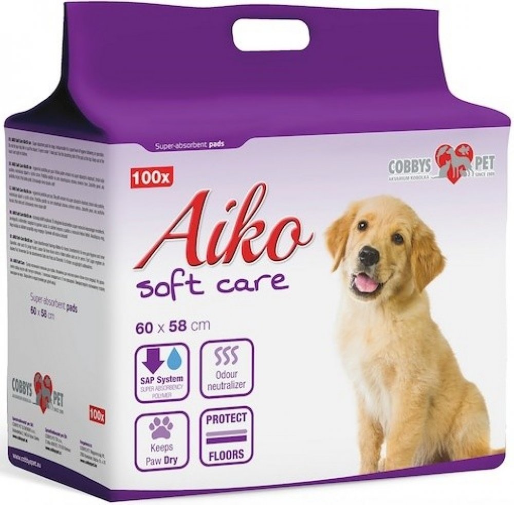 AIKO Soft Care - hygienická podložka pro psy. Díky pěti vrstvám má super absorpční vlastnost, chrání vaše podlahy, neutralizuje zápach a rychle schne. Podložku položte na zem absorbující stranou směrem nahoru. Zabráňte psovi, aby podložku kousal, trhal nebo jedl. Uchovávejte mimo dosah dětí!