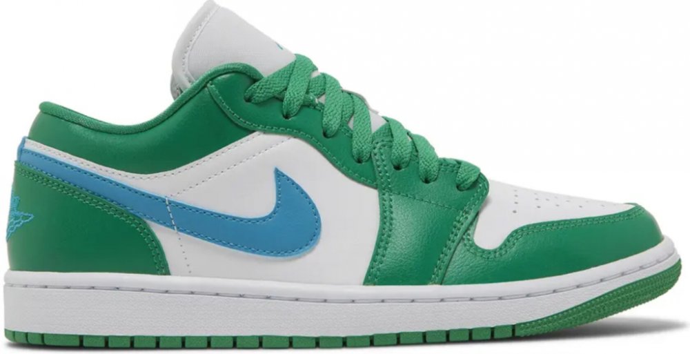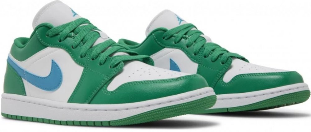 Výrazné zelené překryvy na bílém koženém základu s modrým swooshem - to jsou Air Jordan 1 Low Lucky Green Aquatone.
