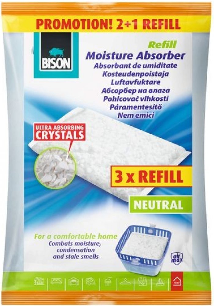 Pohlcovač vlhkosti Bison Multipack absorbuje ze vzduchu nadbytečnou vlhkost do hranice normálu, což je 50–60 %. Krystalky se nasáváním vlhkosti postupně rozpouští. Pohlcená vlhkost je odváděna do nádobky a patentovaný uzávěr ji už nepropustí zpět. Pohlcovač tak zamezuje vzniku plísní, skvrn a korozí. Pracuje po celý rok, je hospodárný a dá se znovu naplnit. S vůní levandule.
