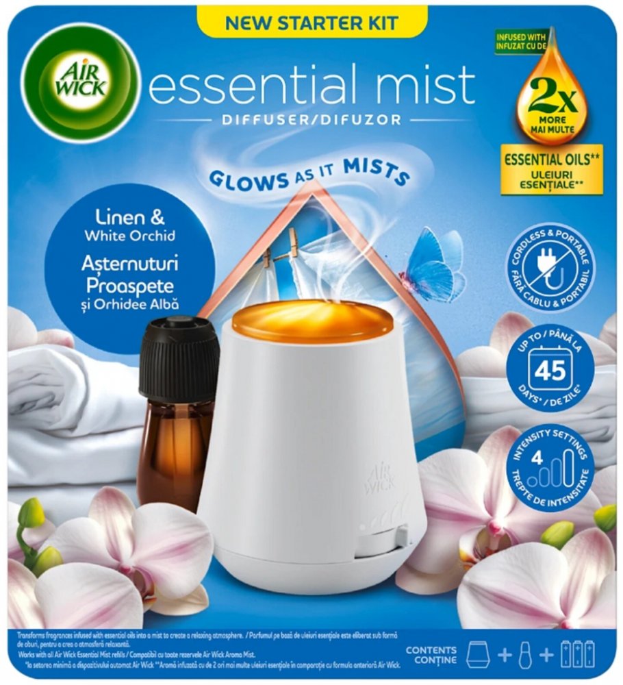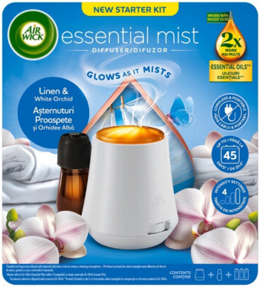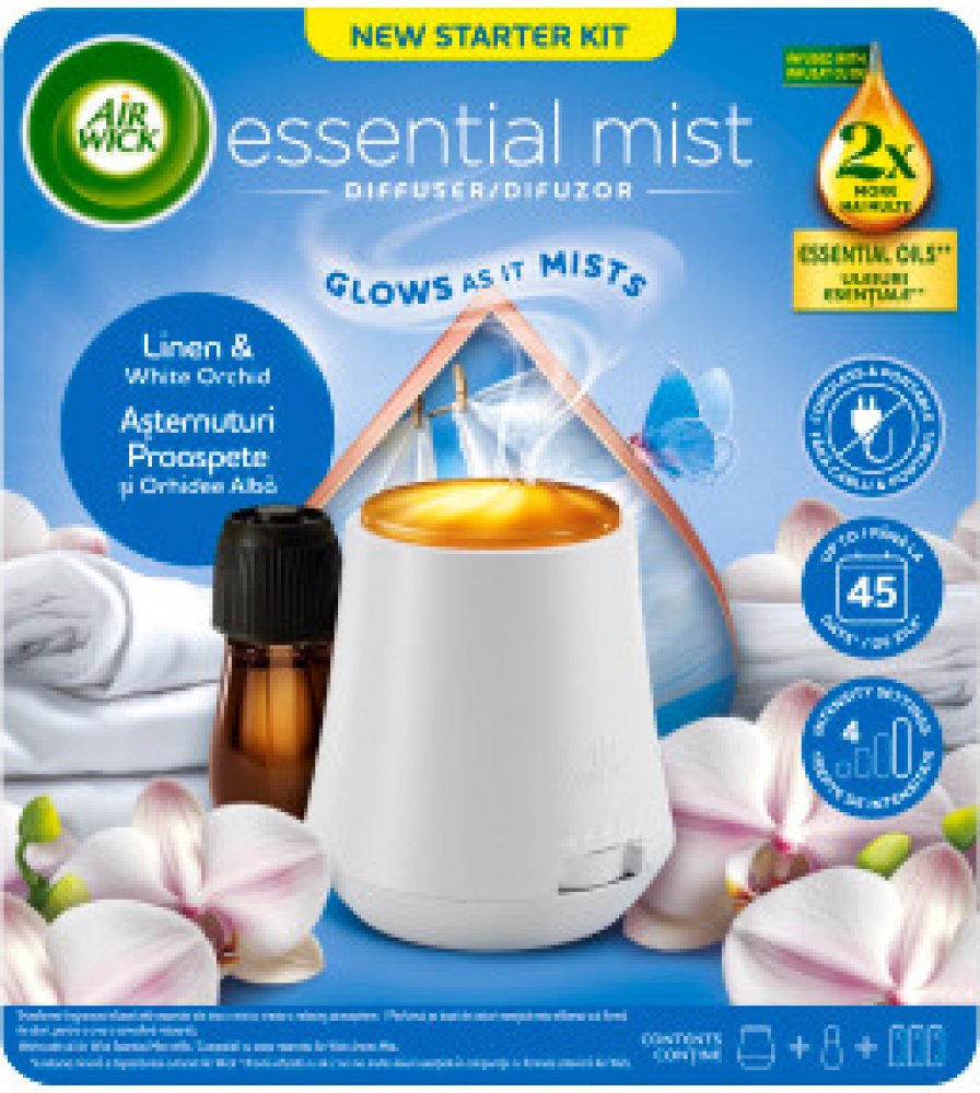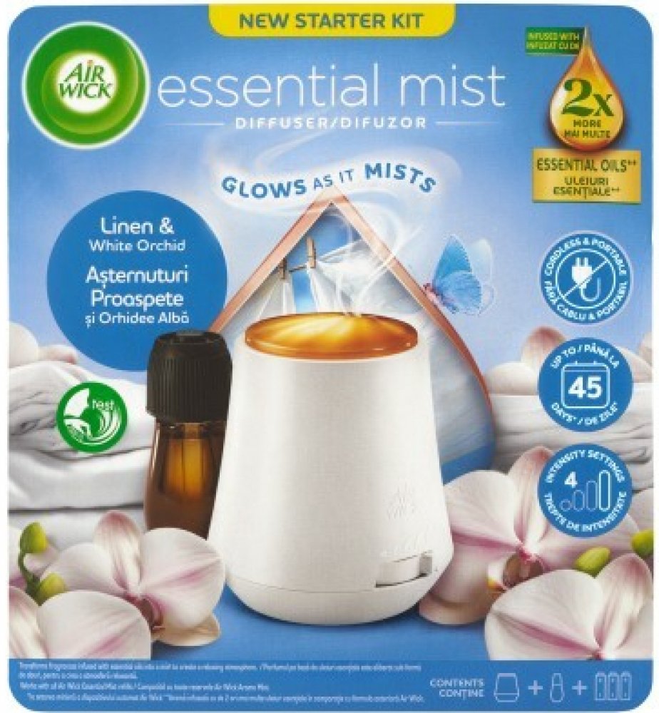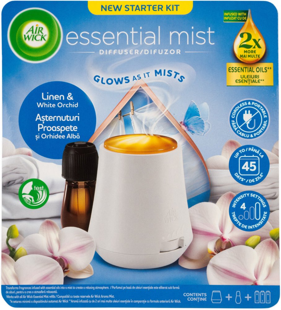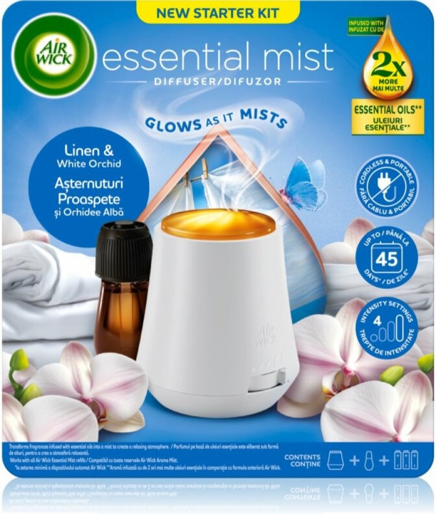 Objevte jemnou svěžest čistého prádla a elegantní vůni květů s aroma difuzérem Air Wick Essential Mist Linen & White Orchid. Tento kompletní set obsahuje difuzér i náplň s esenciálními oleji, které se pomocí jemné mlhy rovnoměrně rozptylují do prostoru. Vůně prádla a bílé orchideje navodí pocit čistoty, klidu a pohody ve vašem domově. Vlastnosti: Kompletní sada: aroma difuzér + náplň 20 ml Vůně Li...