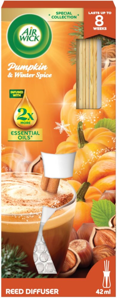 Air Wick Reed Diffuser Pumpkin Spice & Everything Fine, 30 ml, Aroma difuzéry s náplní Vůně do bytu, Aroma difuzér Air Wick Reed Diffuser Pumpkin Spice & Everything Fine představuje příjemný způsob provonění vašeho interiéru. Vlastnosti: ovocná vůně sladké aroma kořenité aroma hřejivá vůně tematická sváteční vůně zimní vůně Jak používat: Uchovávejte mimo dosah dětí. Pokud se náplň difuzéru střetne...