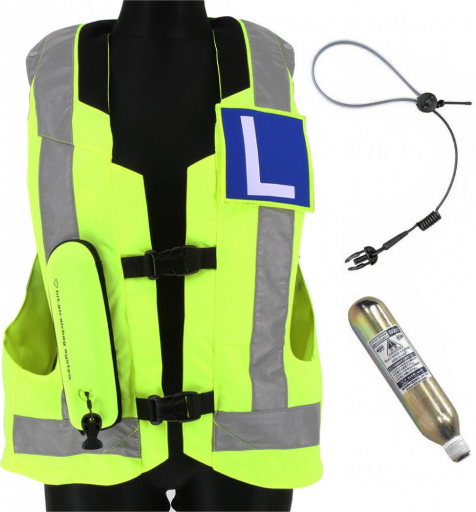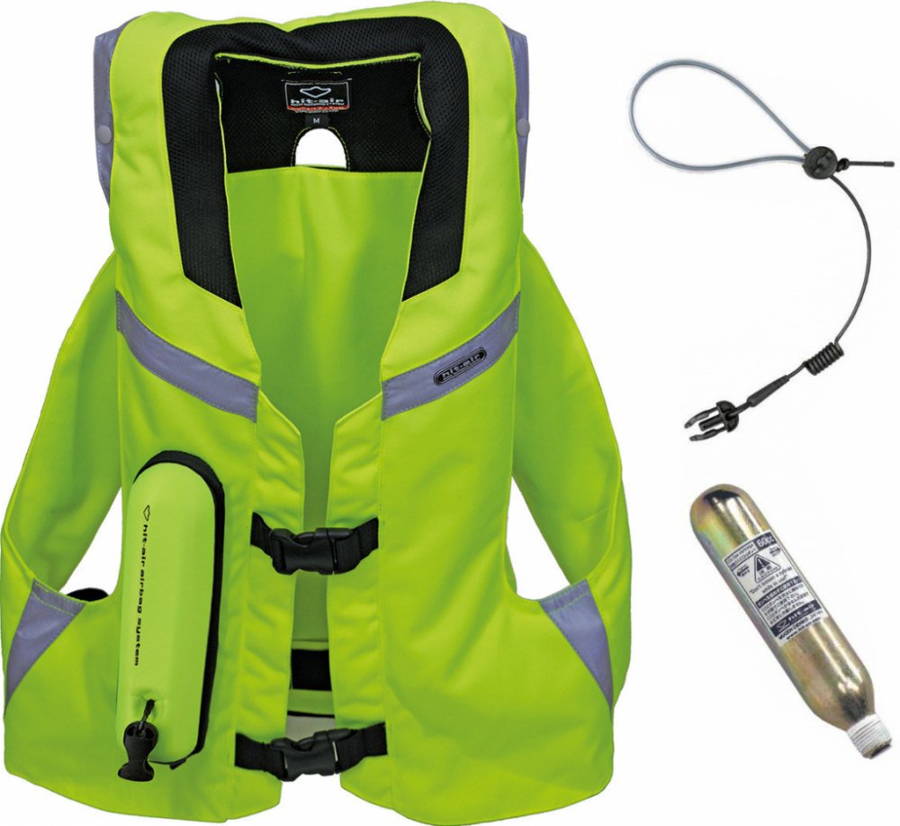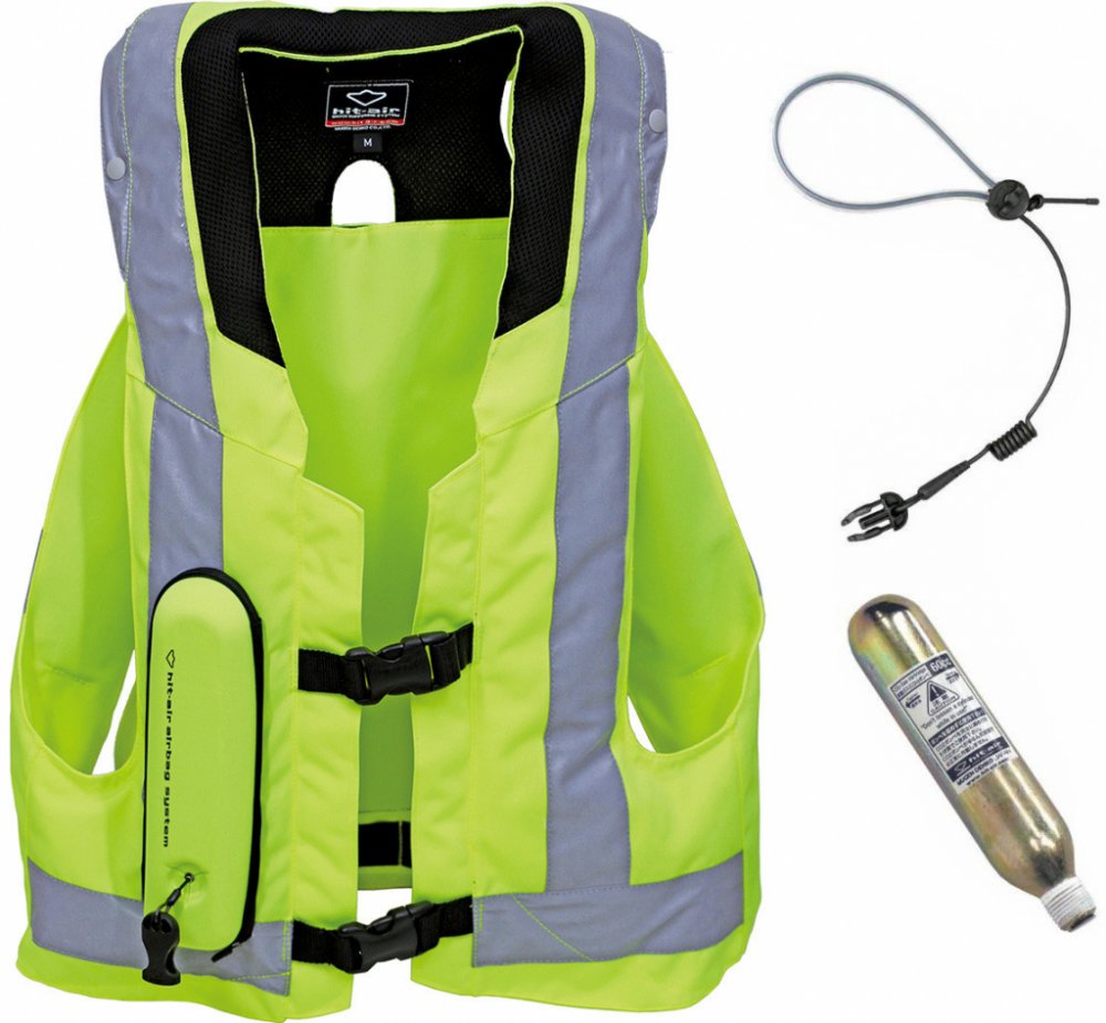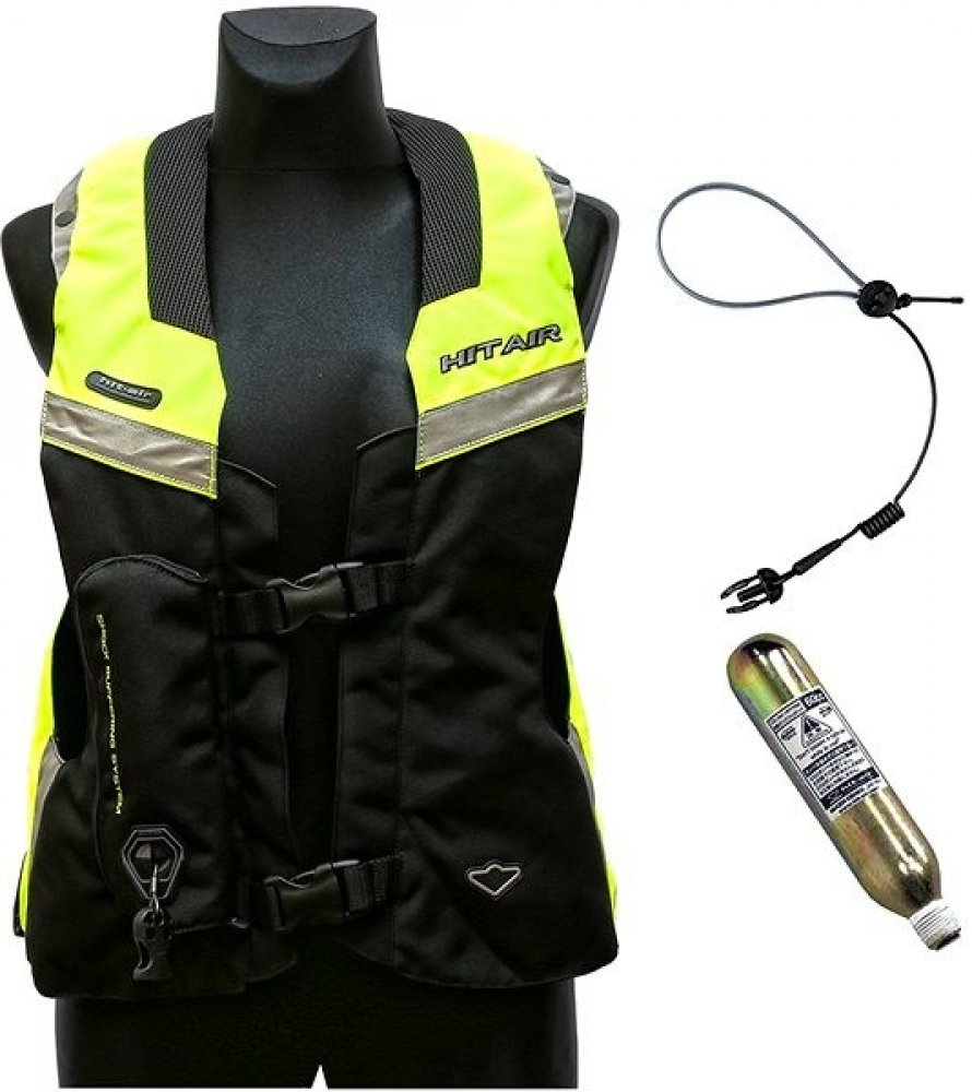 Hit-Air MLV 2 airbag vesta reflexní žlutá s pruhy. Vhodná pro použití s textilními i koženými moto bundami a kombinézami včetně těch s hrbem. Lehká, díky střihu ani nevíte, že ji máte na sobě i při vyšší rychlosti. Bezkonkurenčně velký límec chránící oblasti krku, zátylku. Japonská výroba a kvalita garantovaná společností Hit-Air.
