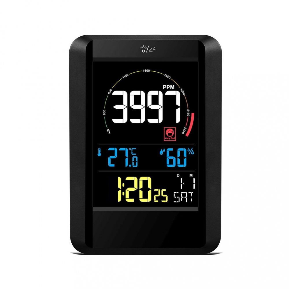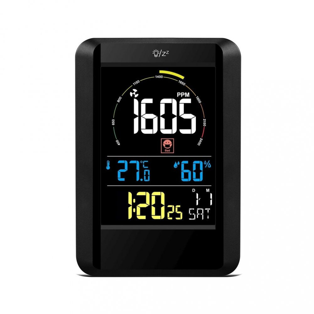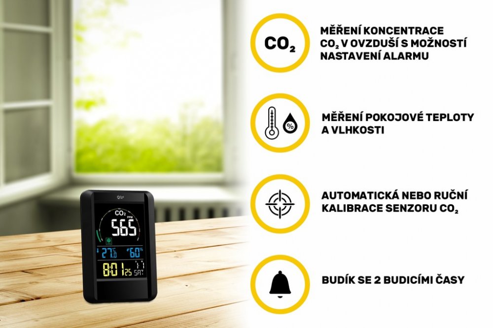 měří teplotu, vlhkost a koncentraci CO2