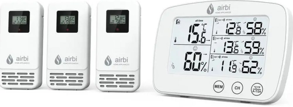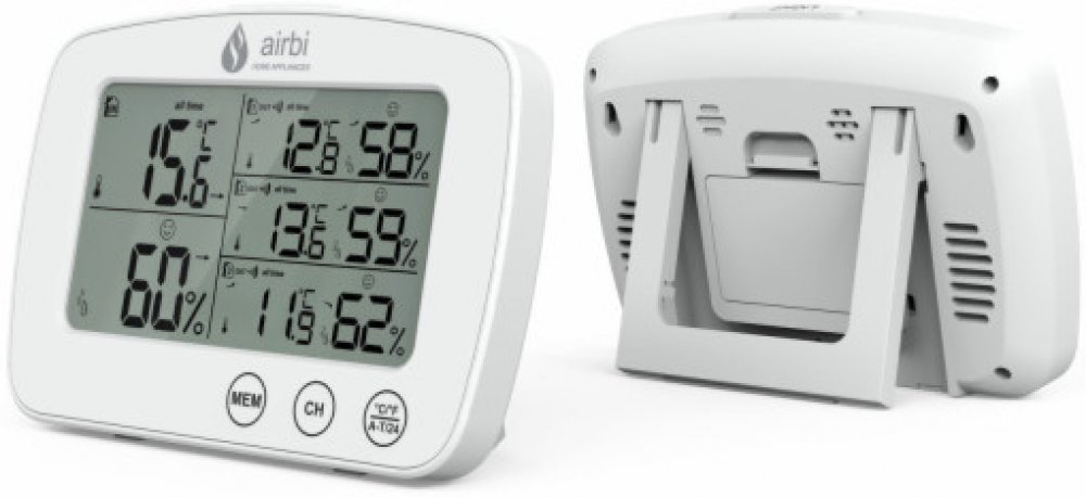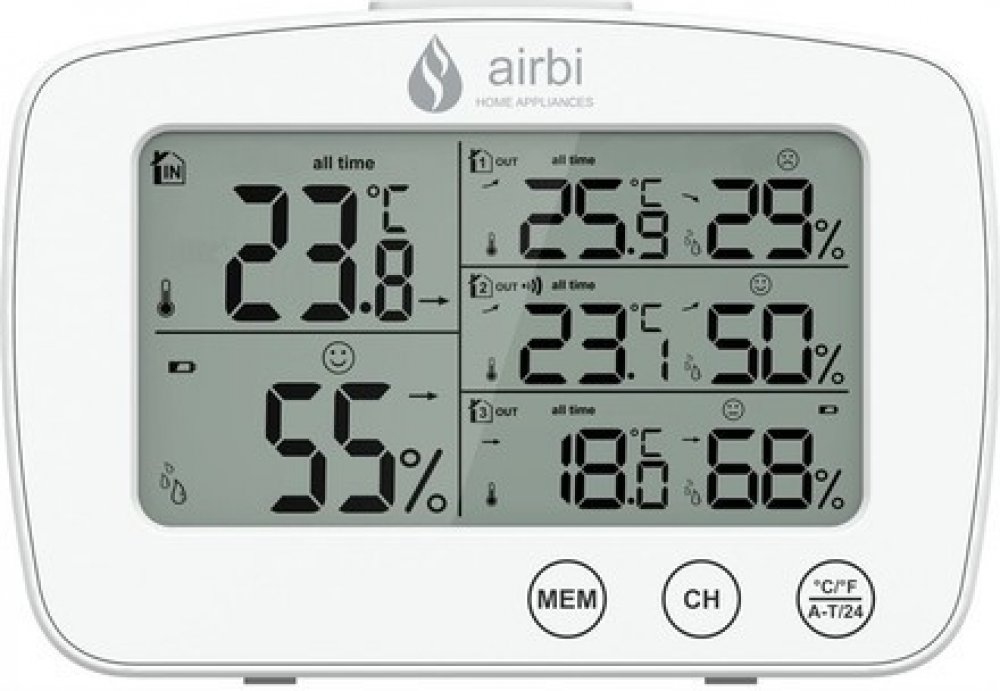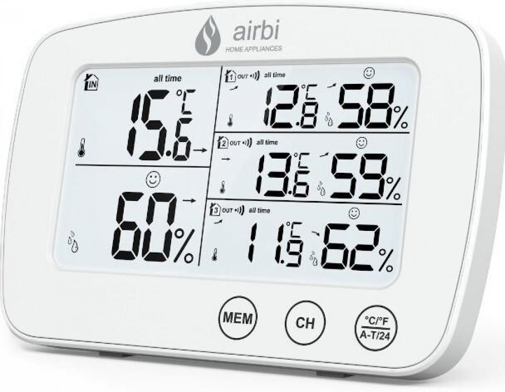 Airbi TRIO má paměť na maximální a minimální hodnoty za celou dobu provozu (reset ruční) a zároveň za posledních 24 hodin (reset automatický). Výhodou jsou i další informační ikony jako např. indikace vývoje teploty či vlhkosti a indikace vlhkostní pohody pomocí smajlíku. Nechybí indikace slabých baterií jak v základně, tak v jednotlivých senzorech.