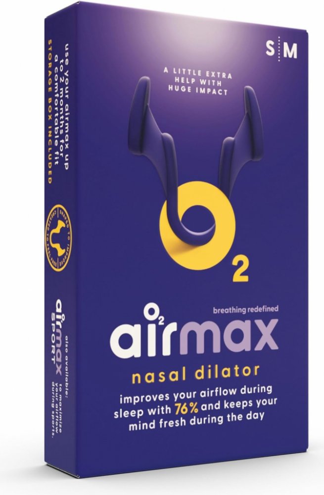 Nosní dilatátor Airmax umožňuje snazší dýchání nosem. Poznáte to lépe proudícím vzduchem skrze nos. Dilatátor zlepšuje dýchání během spánku a může zmírnit projevy chrápání. Lze ho použít i pro lepší cirkulaci vzduchu během cvičení.