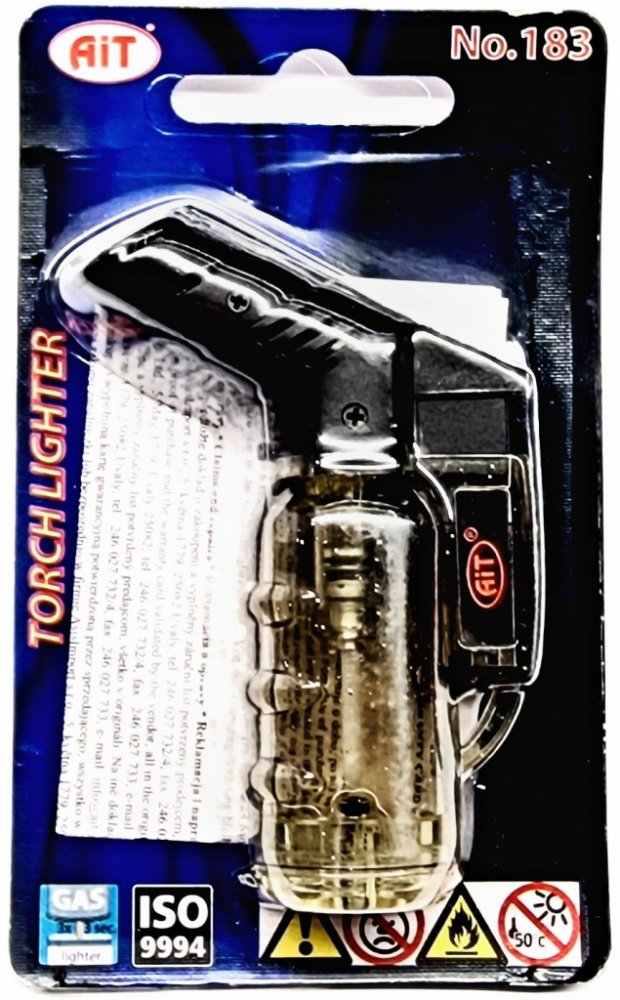 CZ- BEZPEČNOSTNÍ INFORMACE VAROVÁNÍ! UDRŽUJTE MIMO DOSAH DĚTÍ! ZAPALUJTE ZAPALOVAČ DÁLE OD OBLIČEJE A ODĚVU. OBSAHUJE HOŘLAVÝ PLYN POD TLAKEM. NIKDY NEVYSTAVUJTE TEPLOTĚ VYŠŠÍ NEŻ 50 * C NEBO DLOUHÉ-MU SLUNEČNÍMU ZÁŘENÍ. NIKDY NEPRORÁŽEJTE NEBO NEVHAZUJTE DO OHNĚ. UJISTÈTE SE, ŽE PLAMEN JE PO POUŽITÍ UHAŠEN. NAD VIDITELNOU ČÁSTÍ PLAMENE JE VYSOKÁ TEPLOTA. MIMOŘÁDNÁ POZORNOST MUSÍ BÝT VĚNOVÁNA ZABRÁNĚNÍ VZNIKU POPÁLENÍ A OHNĚ. NEPONECHÁVEJTE ZAPÁLENÝ DÉLE NEŽ 10S. PLNĚNÍ PLYNEM_(pouze pro_ plnici zapalovače). Plňte pouze standartni butanovou náplni pro cigaretové zapalovače. Při plnění otočte plnici ventil zhūru, butanovou náplň držte svisle a trysku pevně přitiskněte k ventilu. Plňte 3-4 krátkými vpichy. Syčeni signalizuje, že probihá plněni. Jakmile je zapalovač plný. odtáhněte trysku a vyčkejte 30-40 sekund před dalšim použitim. Nepřeplňujte ! REGULACE DELKY PLAMENE: pomocí reuglační páčky (+ velkýplamen, -malý plamen). Dovozce/Importer: AsisImport s.r.o.,5. května 1779, 250 82 Úvaly. e-mail: ait@ait-praha.cz.EAN:8594029213579
