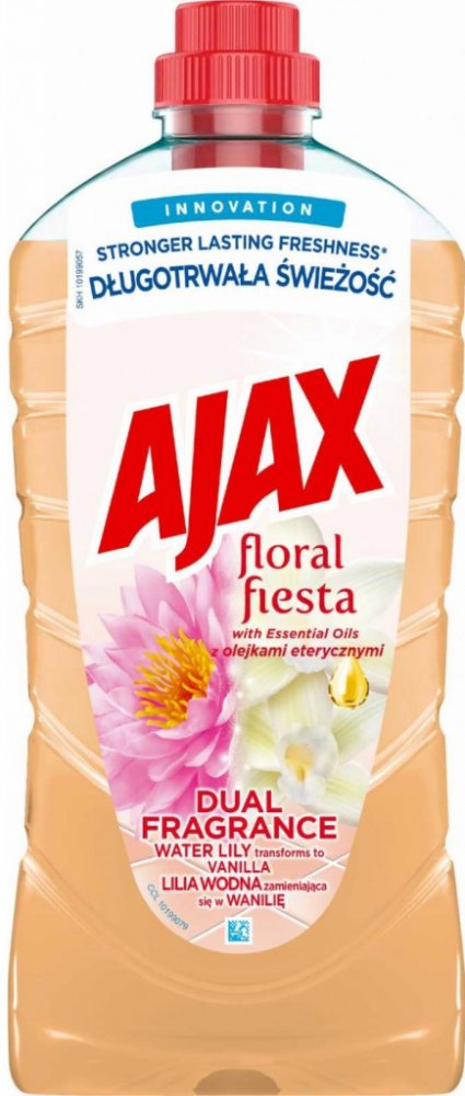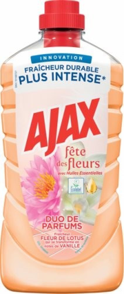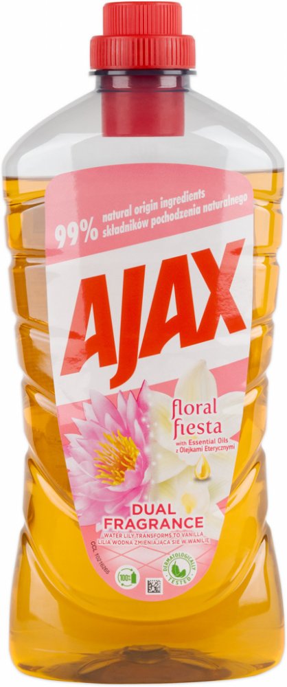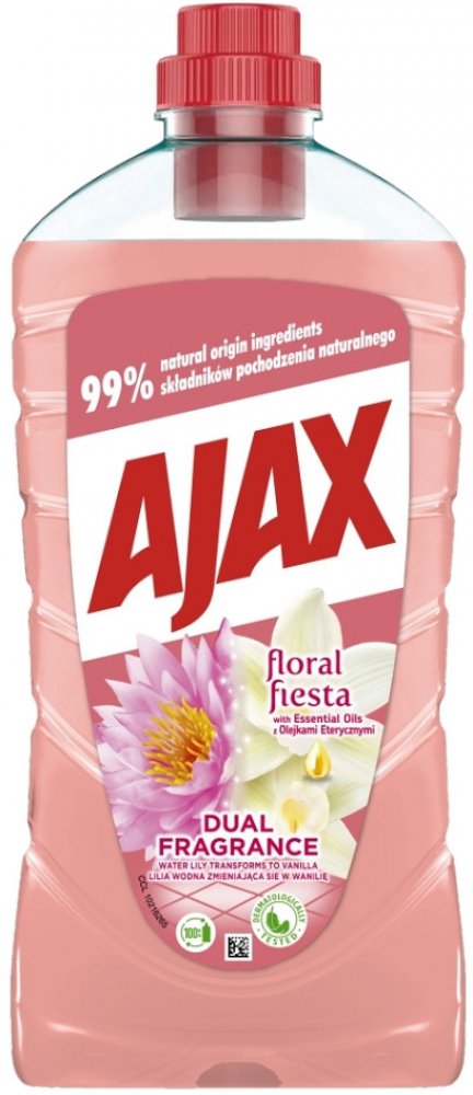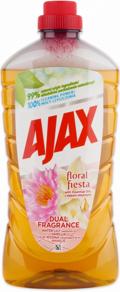 Svěží vůně čistoty dokonce i následující den! Ajax na podlahy s jeho unikátní svěžestí, aktivující se vzduchem, uvolňuje svojí vůni leknínu a vanilky nepřetržitě po dobu více než 24 hodin. Vysoce efektivní čistící prostředek. Čistí do hloubky a zanechává povrchy zářivě čisté. Bez oplachování. Neutrální pH - respektuje citlivé povrchy (mramor, keramika...). Povrchy, které přicházejí do kontaktu s jídlem, opláchněte pitnou vodou.POUŽITÍ:Pro úklid velkých ploch zřeďte 18 ml s 5 l vody. Na odolné skvrny použijte nezředěný přípravek.SLOŽENÍ:Obsahuje <5% aniontově povrchové aktivní látky, neiontové povrchově aktivní látky.UPOZORNĚNÍ:VAROVÁNÍ. Způsobuje vážné podráždění očí. Uchovávejte mimo dosah dětí. Při zasažení očí několik minut opatrně vyplachujte vodou. Přetrvává-li podráždění očí, vyhledejte lékařskou pomoc. Může vyvolat alergickou reakci.ŽIVOTNÍ PROSTŘEDÍ:Zcela prázdný a důkladně čistý plastový obal je možné recyklovat. Neodhazujte do volné přírody. Chraňte životní prostředí recyklací.