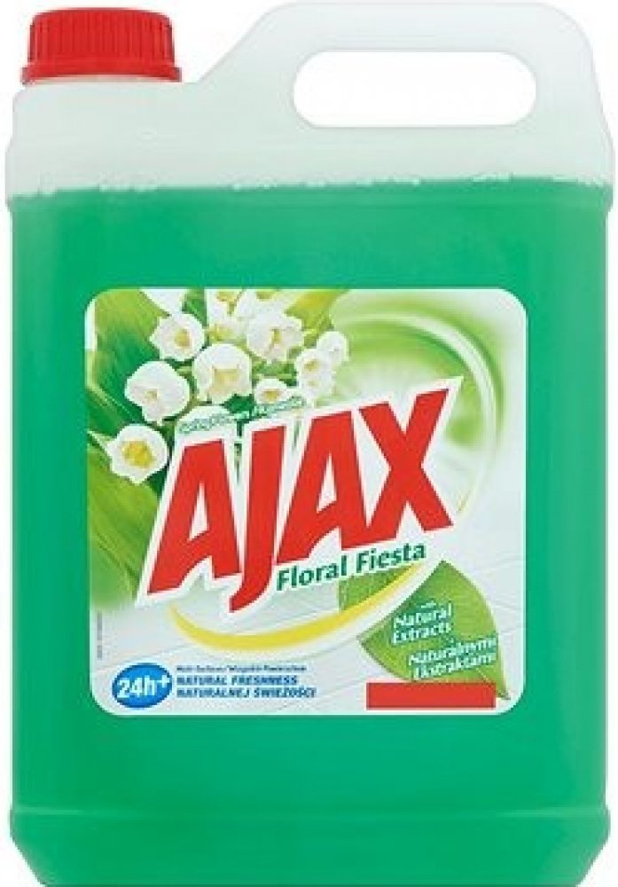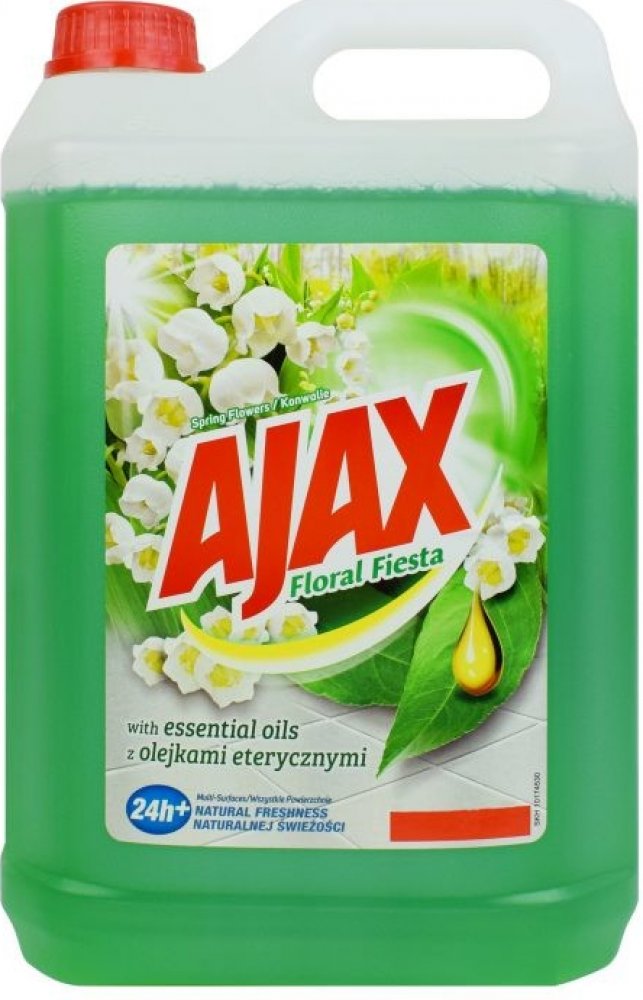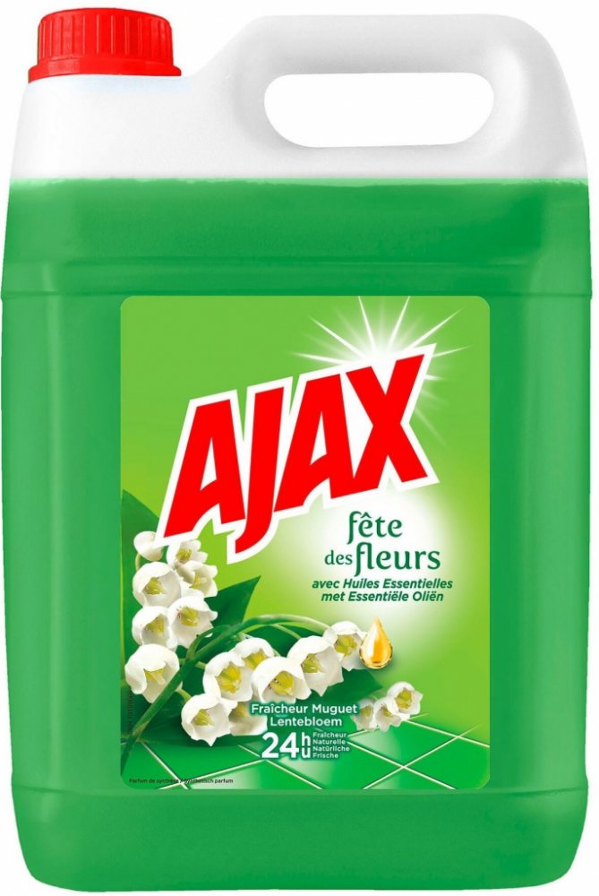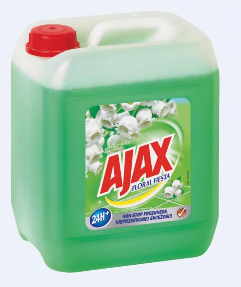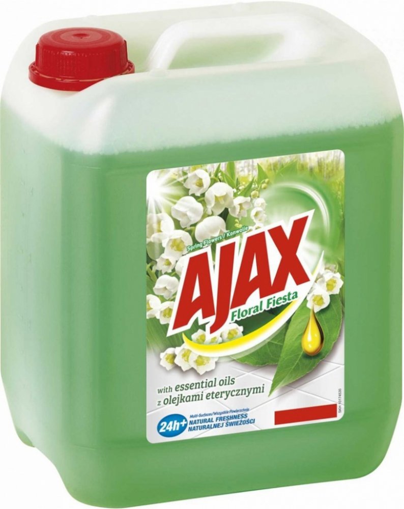 Ajax 5 l Spring Flowers - svěží vůně konvalinek a čistoty dokonce i následující den! Ajax Spring Flowers s jeho unikátní svěžestí, aktivující se vzduchem, uvolňuje svojí květinovou vůni nepřetržitě po dobu více než 24 hodin - jako květina. Čistí do hloubky a zanechává povrchy zářivě čisté. Konvalinky provoní váš domov okouzlující vůní. Bez oplachování. Neutrální pH - respektuje citlivé povrchy (mramor, keramika...). Povrchy, které přicházejí do kontaktu s jídlem, opláchněte pitnou vodou.POUŽITÍ:Pro úklid velkých ploch zřeďte 72 ml na 6 l vody. Na odolné skvrny použijte nezředěný přípravek.SLOŽENÍ:Viz Ingredients na obalu produktu.UPOZORNĚNÍ:VAROVÁNÍ. Způsobuje vážné podráždění očí. Uchovávejte mimo dosah dětí. Při zasažení očí několik minut opatrně vyplachujte vodou. Přetrvává-li podráždění očí, vyhledejte lékařskou pomoc. Může vyvolat alergickou reakci.ŽIVOTNÍ PROSTŘEDÍ:Zcela prázdný a důkladně čistý plastový obal je možné recyklovat. Chraňte životní prostředí recyklací. Má to smysl. Správným dávkováním šetříte životní prostředí i peněženku.