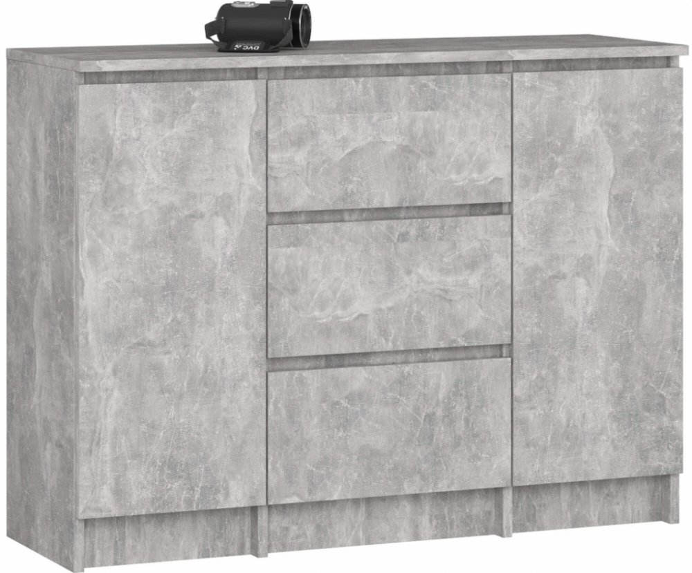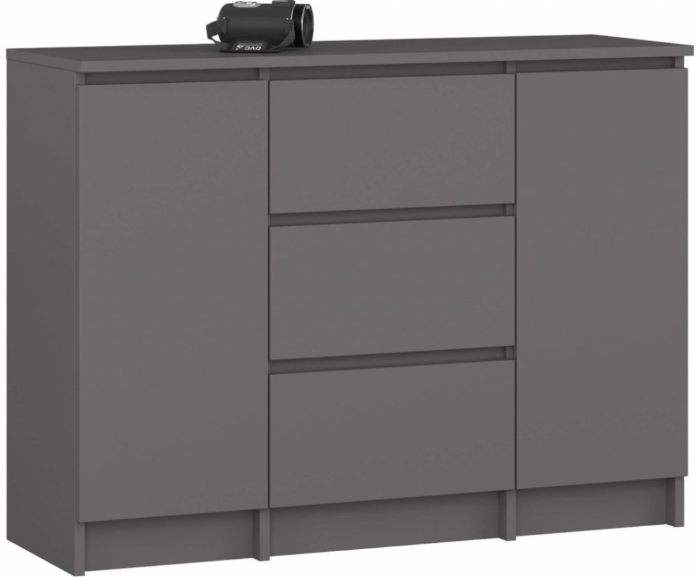 Elegantní linie a kompaktní rozměry dělají z této komody praktický úložný prostor, aniž by působila mohutně nebo těžkopádně. Na čelní straně najdete tři prostorné zásuvky a dvě dvířka, za nimiž se ukrývají vnitřní police. Všechny zásuvky jsou osazené kovovými kuličkovými pojezdy, které zajišťují hladký a tichý chod i při častém používání.