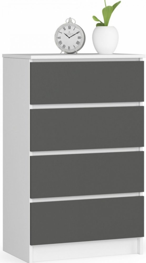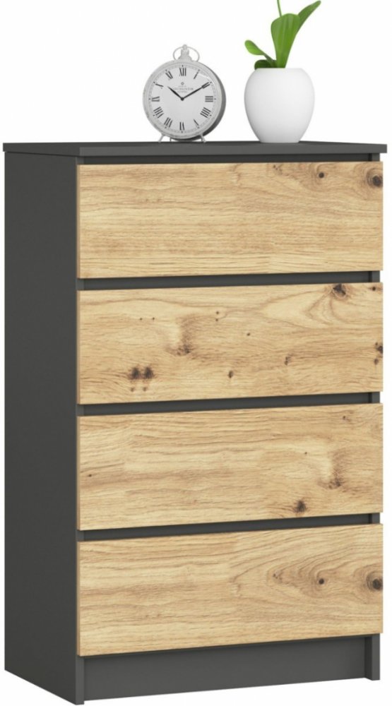 Nadčasová elegance a jednoduchost spojená v jednom kousku nábytku - komoda Kuba se 4 zásuvkami v krásné kombinaci grafitu a dubu artisan. Tato moderní komoda přináší do vašeho interiéru šmrnc, který zaujme v každém moderním pokoji s nádechem skandinávského stylu. Její jednoduchý design a svěží barevná kombinace vytvářejí harmonii s okolním prostředím, zejména v místnosti s jemnými, světlými tóny.
