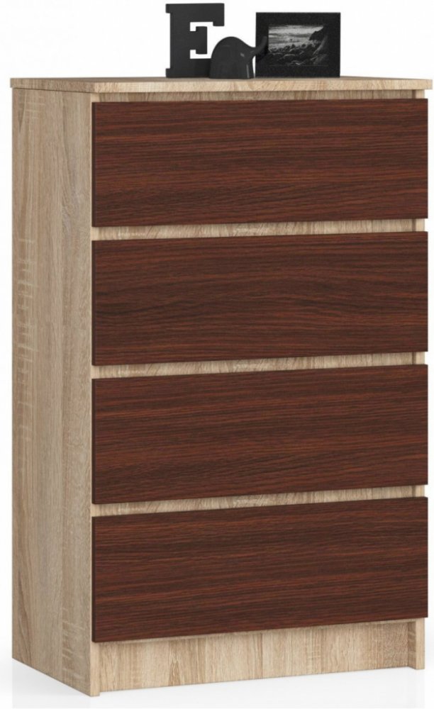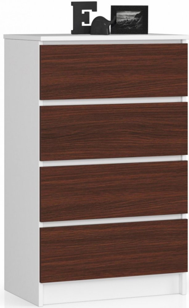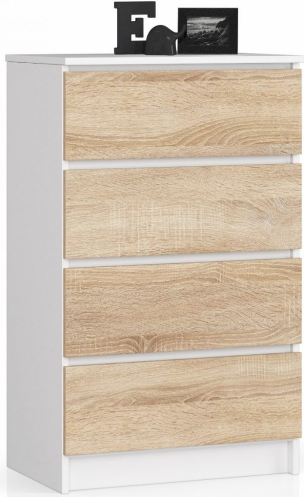 Tato komoda není jen krásná, ale také vysoce funkční. Je vyrobena z otěruvzdorné laminované desky o tloušťce 16 mm s ABS pokrytými hranami, což zaručuje její dlouhou životnost a odolnost proti poškození. Každá ze čtyř zásuvek se pohybuje na hladkých kovových kolejnicích, což vám umožní snadný přístup k vašim věcem a udržuje komodu v dokonalém stavu. Je univerzálním kouskem nábytku, který můžete využít nejen v obývacím pokoji, ale také v ložnici, kanceláři nebo na jakémkoli jiném místě, kde potřebujete stylový úložný prostor s moderním šmrncem. S touto komodou získáte nejen elegantní a moderní kousek nábytku, ale také praktický prostor pro všechny vaše drobnosti. Navíc je dodávána v demontovaném stavu, což usnadňuje její přepravu a montáž.