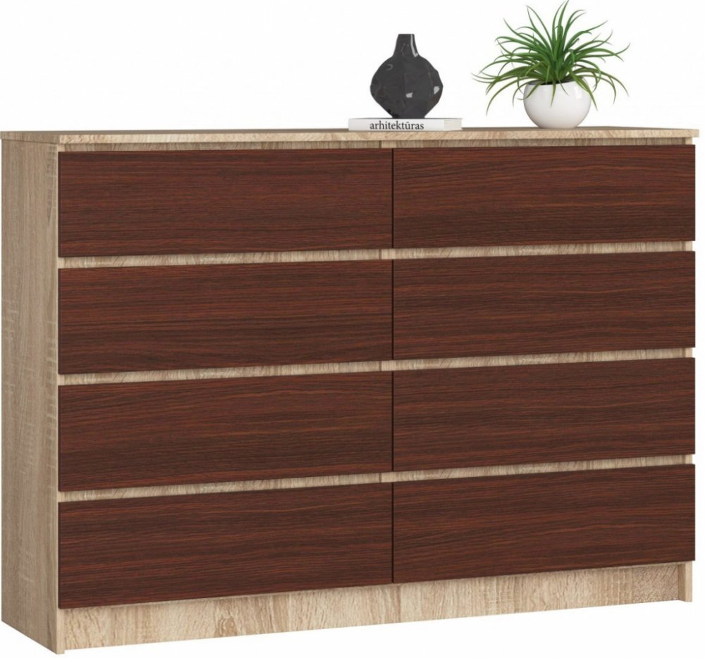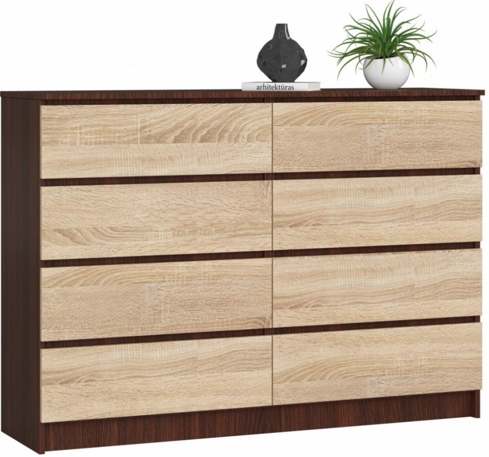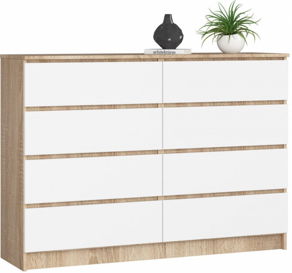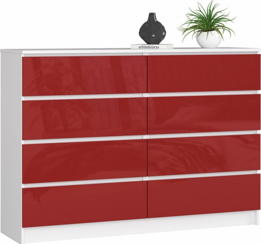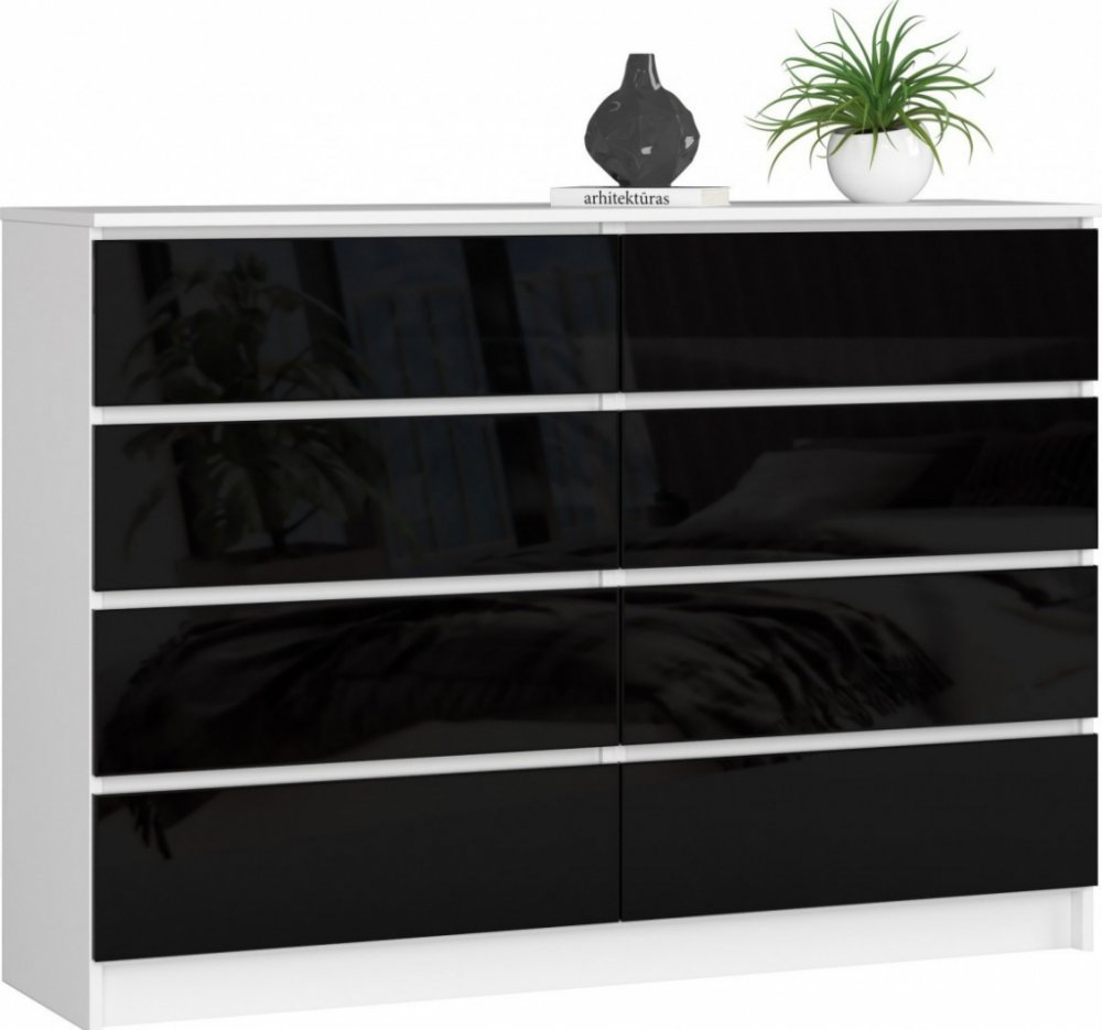 Materiál komody tvoří otěruvzdorná laminovaná deska o tloušťce 16 mm a hrany, které jsou pokryty ABS hranami, díky čemuž jsou odolné proti poškození. Čelo je vyrobeno z 19 mm akrylové desky v bílem dekoru s vysokým leskem. Komoda je vybavena osmi zásuvkami a každá z nich se pohybuje na kovových kolejnicích - tento mechanismus funguje hladce a bezchybně. V lesklém provedení jsou jen čela, zbývající části v matu