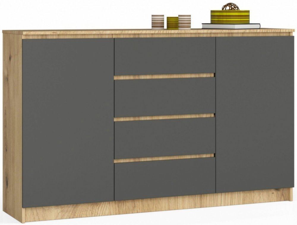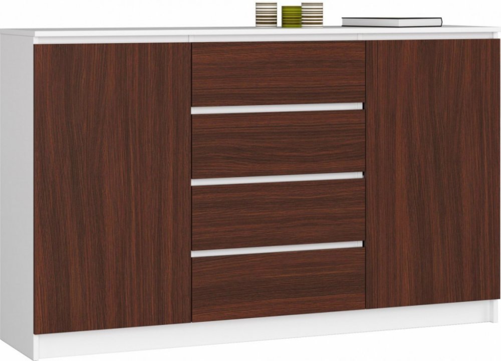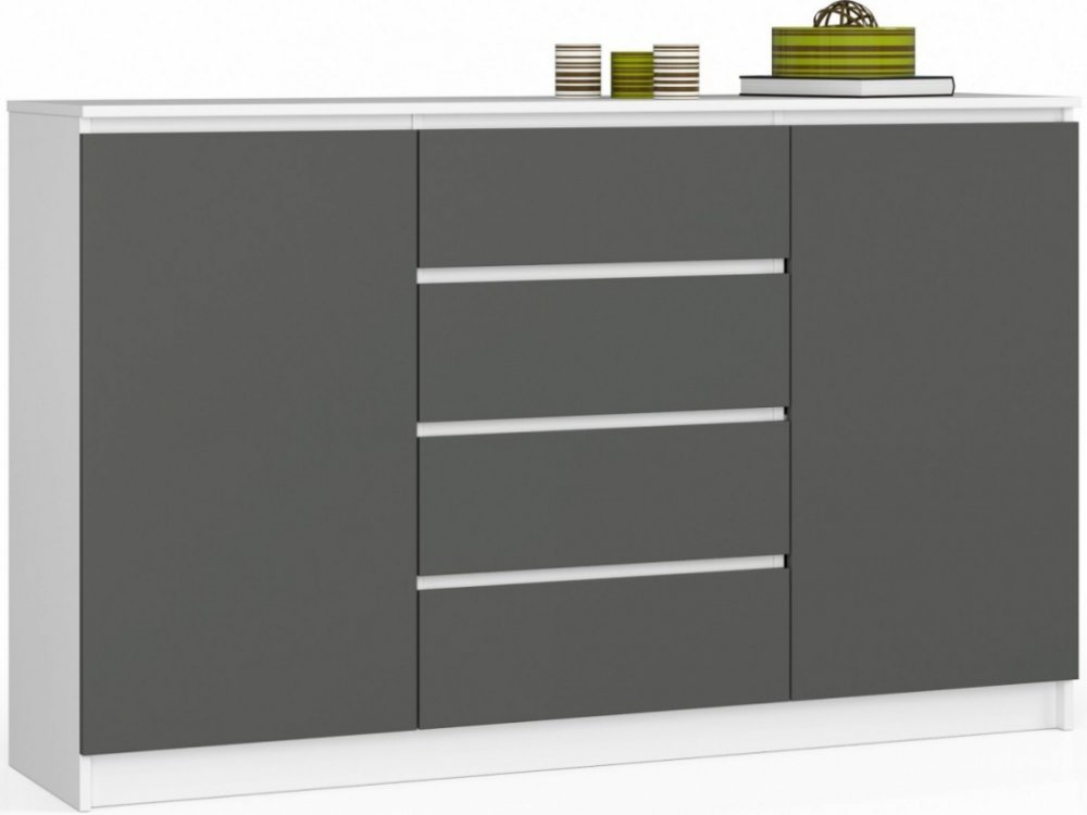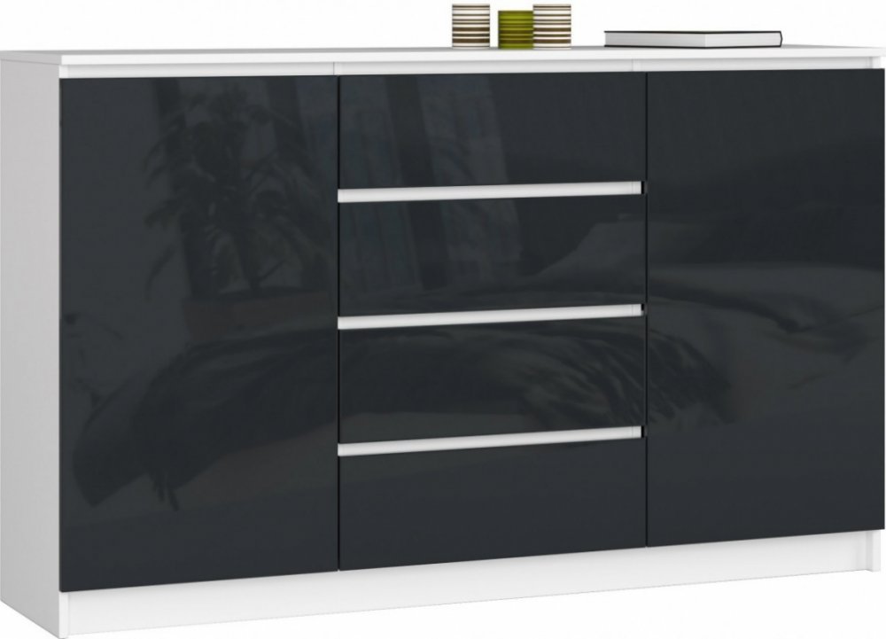 Materiál komody tvoří otěruvzdorná laminovaná deska o tloušťce 16 mm a hrany, které jsou pokryty ABS hranami, díky čemuž jsou odolné proti poškození. Čelo je vyrobeno z 19 mm akrylové desky v bílém dekoru s vysokým leskem. Komoda je vybavena 2 skříňkami s poličkou a 4 zásuvkami - každá z nich se pohybuje na kovových kolejnicích - tento mechanismus funguje hladce a bezchybně. V lesklém provedení jsou jen čela, zbývající části v matu.