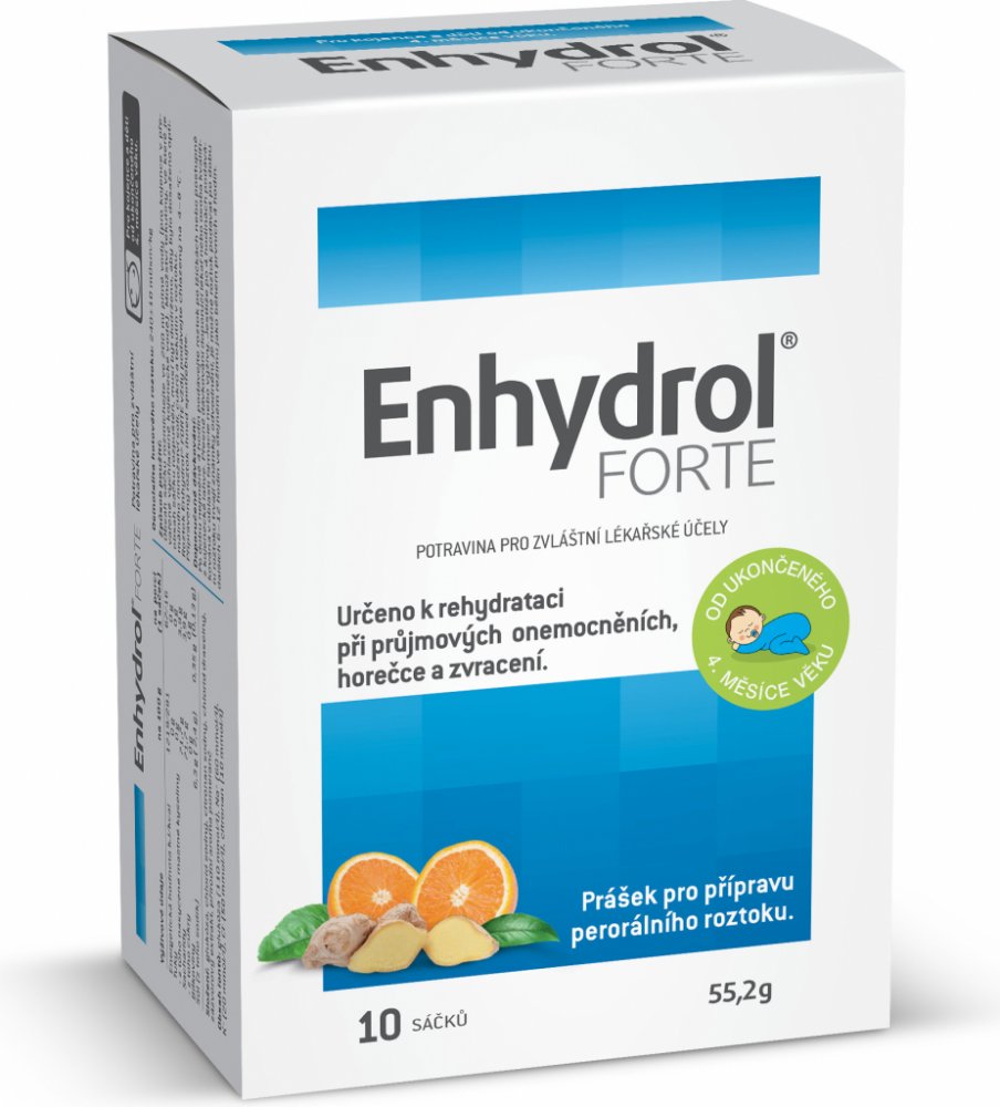 Enhydrol Forte je potravina pro zvláštní lékařské účely určená k rehydrataci při průjmových onemocněních, horečce a zvracení pro dospělé a děti od ukončeného 4. měsíce věku. Má složení odpovídající požadavkům ESPGHAN* s chutí zázvoru a pomeranče. Složení doporučené skupinou ESPGHAN je nejvhodnější složení pro evropskou dětskou populaci.