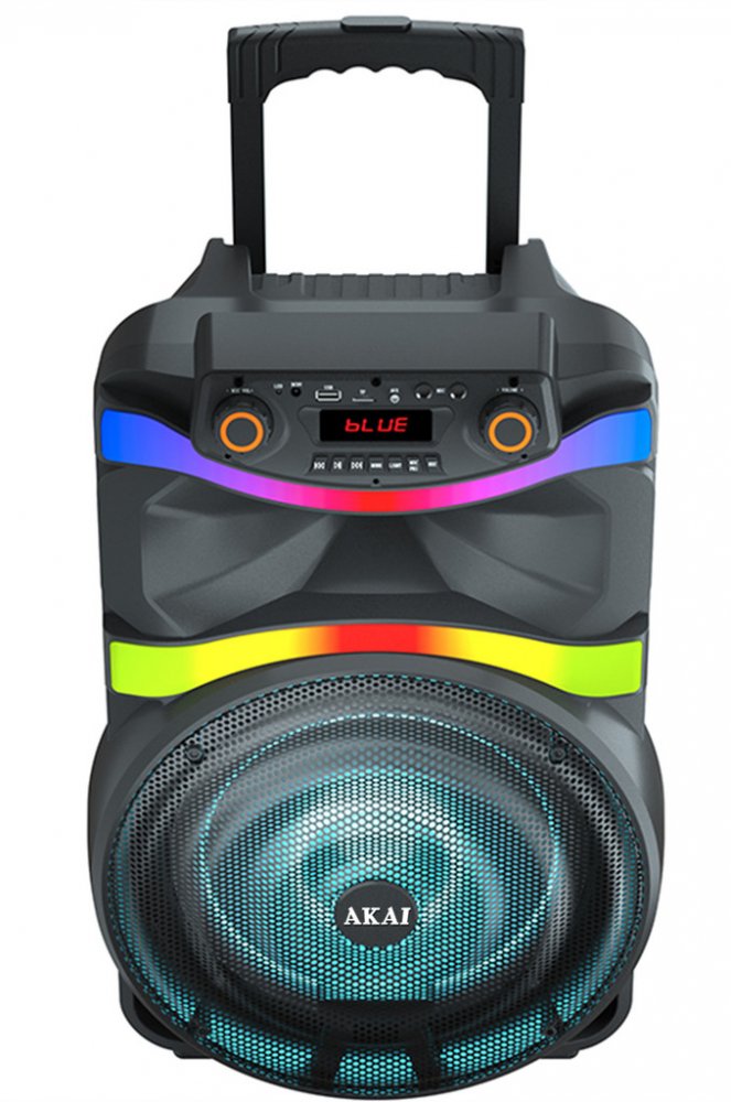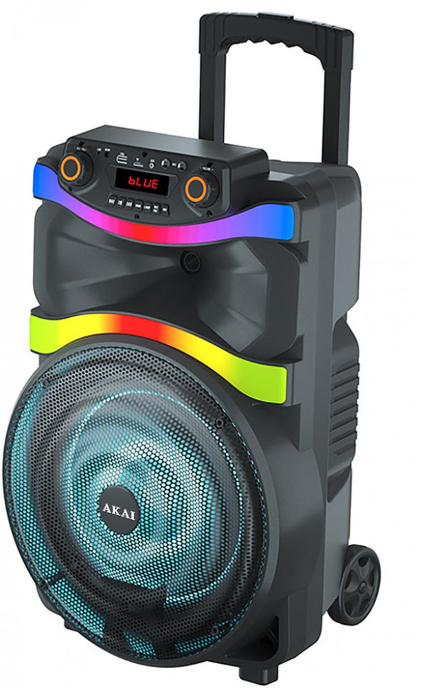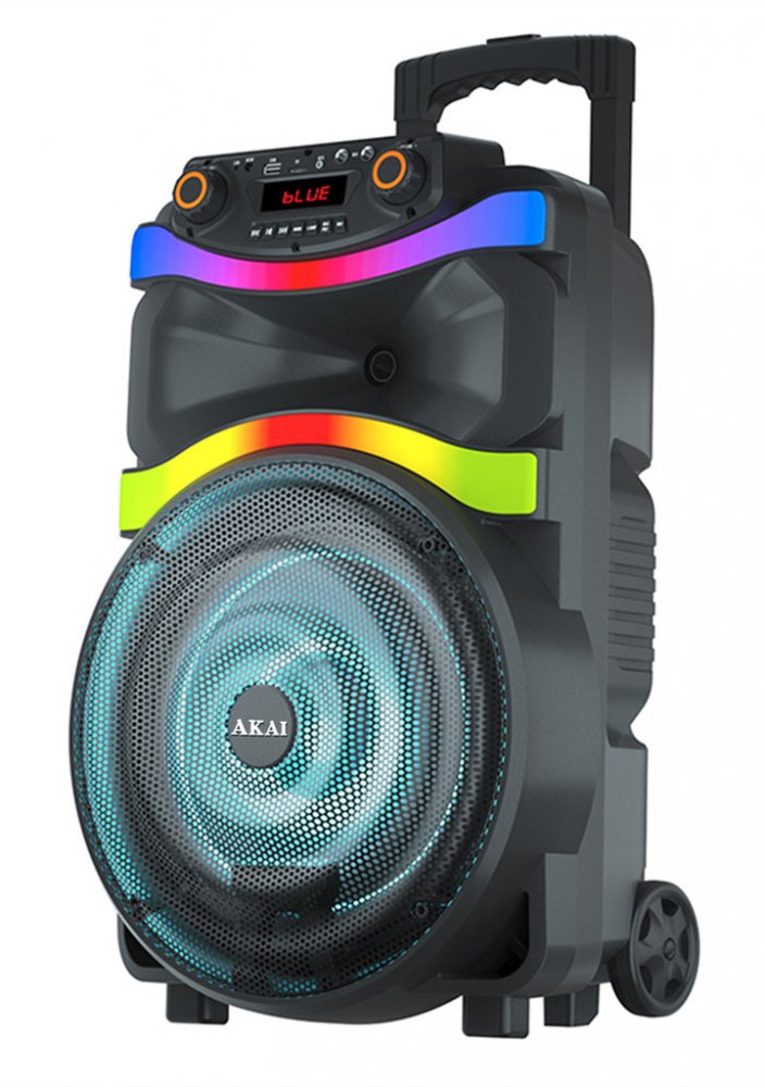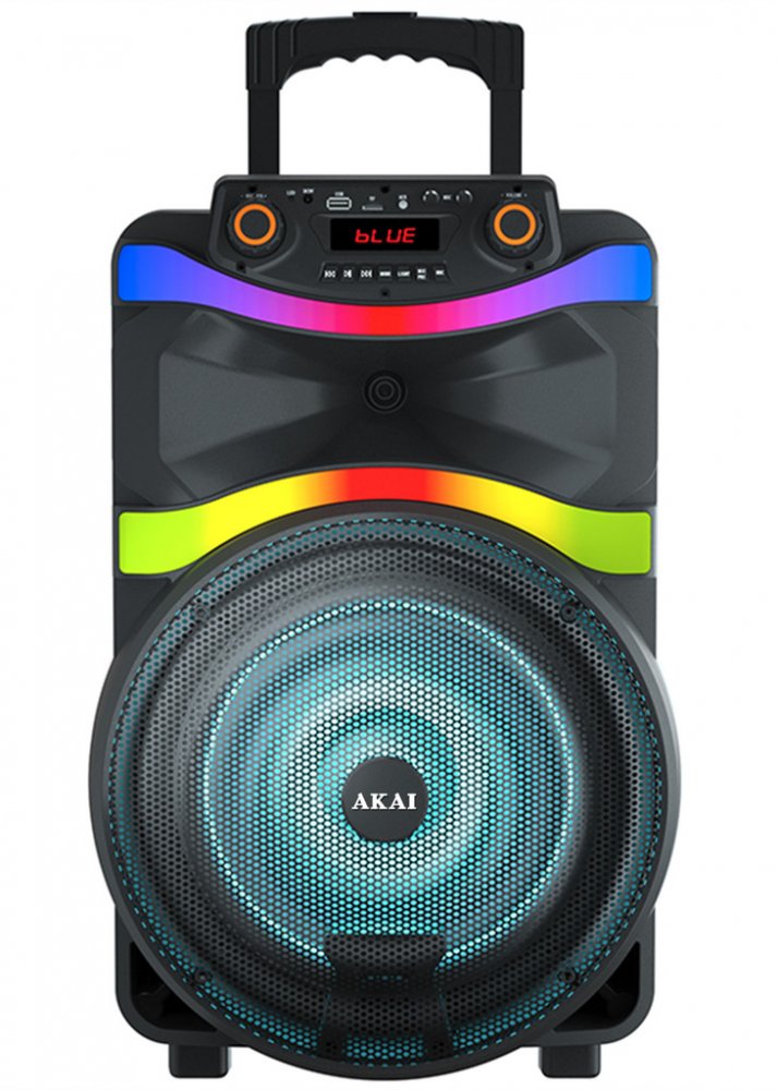 Vlastnosti:- bluetooth verze: 5.0- bluetooth frekvence: 2,402 - 2,480 GHz- bluetooth akční rádius 10 m- výkon: 25 W RMS- FM rádio: 87,5 - 108 MHz- frekvenční rozsah: 80 - 18.000 Hz- reproduktor: 1x 12", 1x 2" tweeter- funkce AWS (AKAI Wireless speaker), propojení 2 repro přes bluetooth pro stereo efekt- výsuvné madlo, kolečka pro lepší komfort přenášení- dálkový ovladač- napájení z baterie: 7,4V Li-Ion 1800mAh- napájení ze sítě: 110-240V přes adaptér DC 9V- rozměry: 36 x 30 x 57 cm- hmotnost: 5,6 kg- balení obsahuje: nabíječka, AUX kabel, dálkový ovladač, bezdrátový mikrofon, návod.
