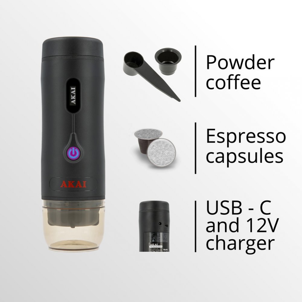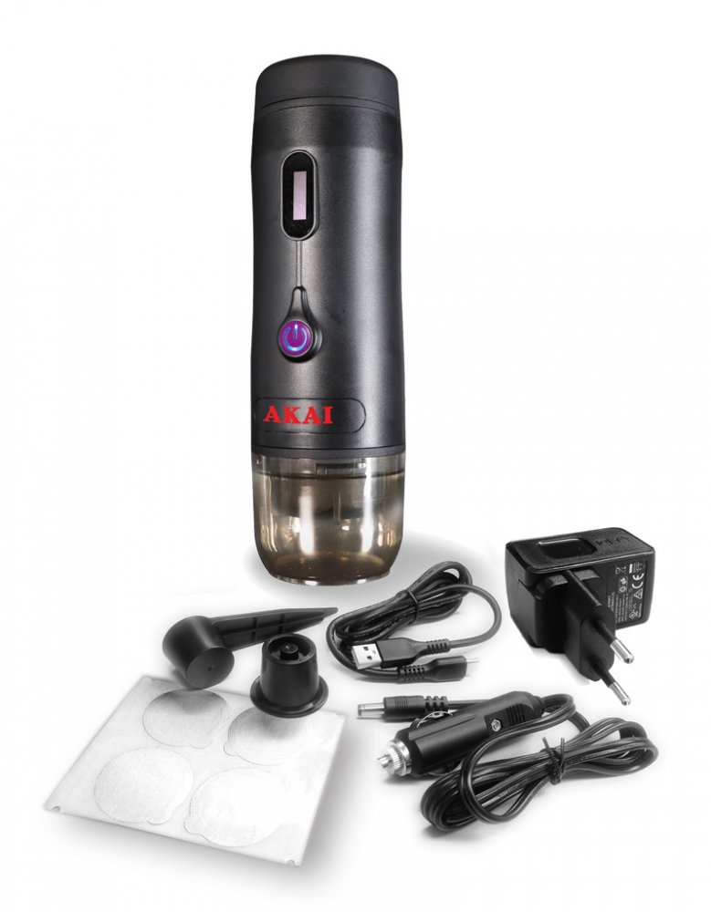 Zahrnuje: Přenosný espresso kávovar AKAI, 12V nabíječku do auta a napájecí adaptér