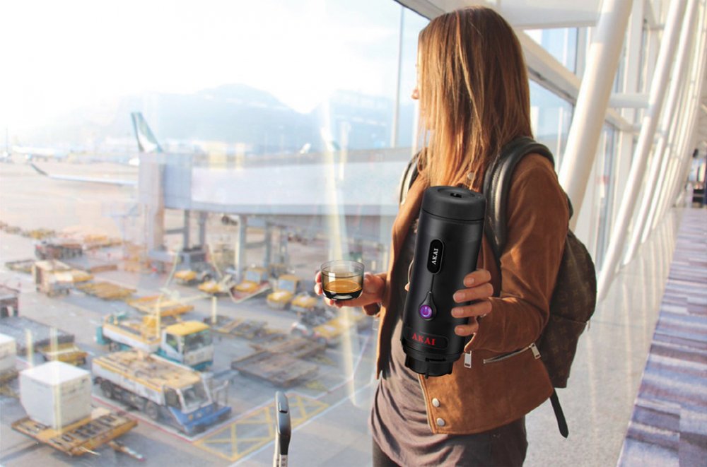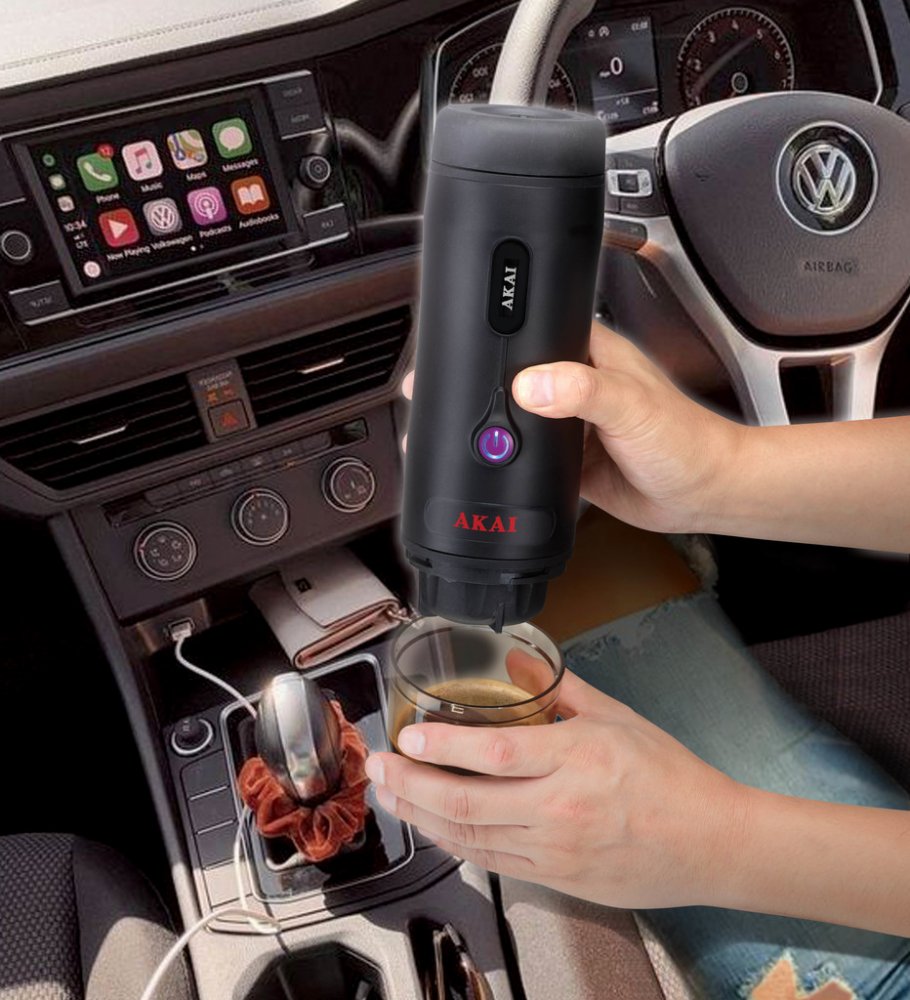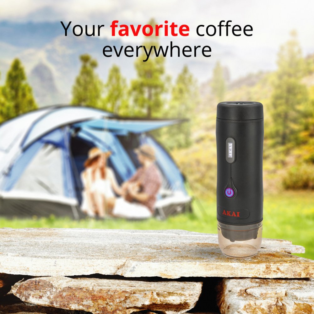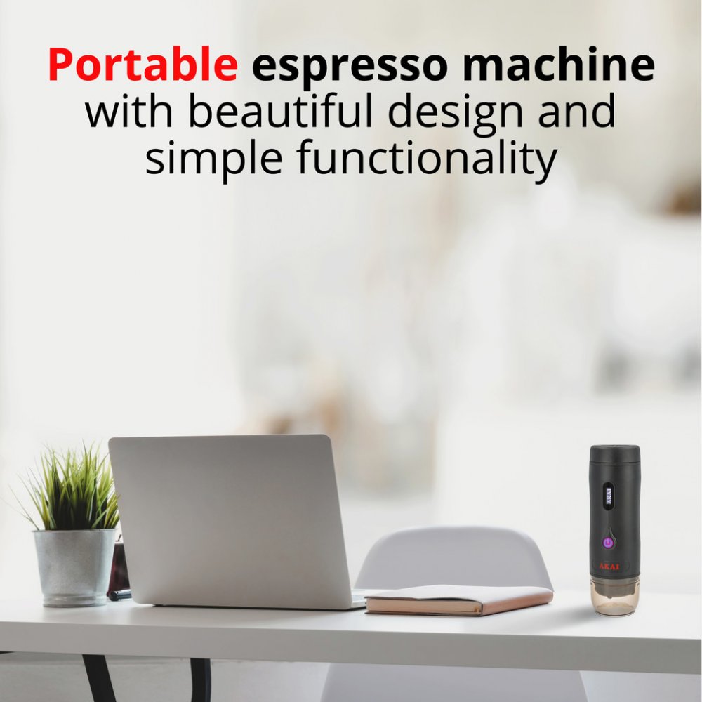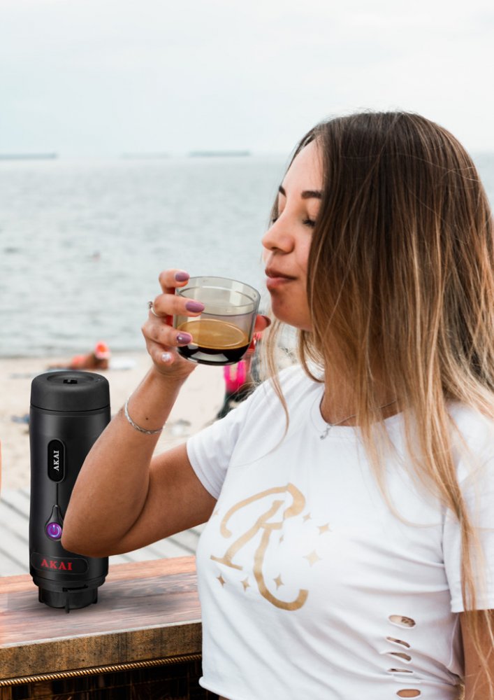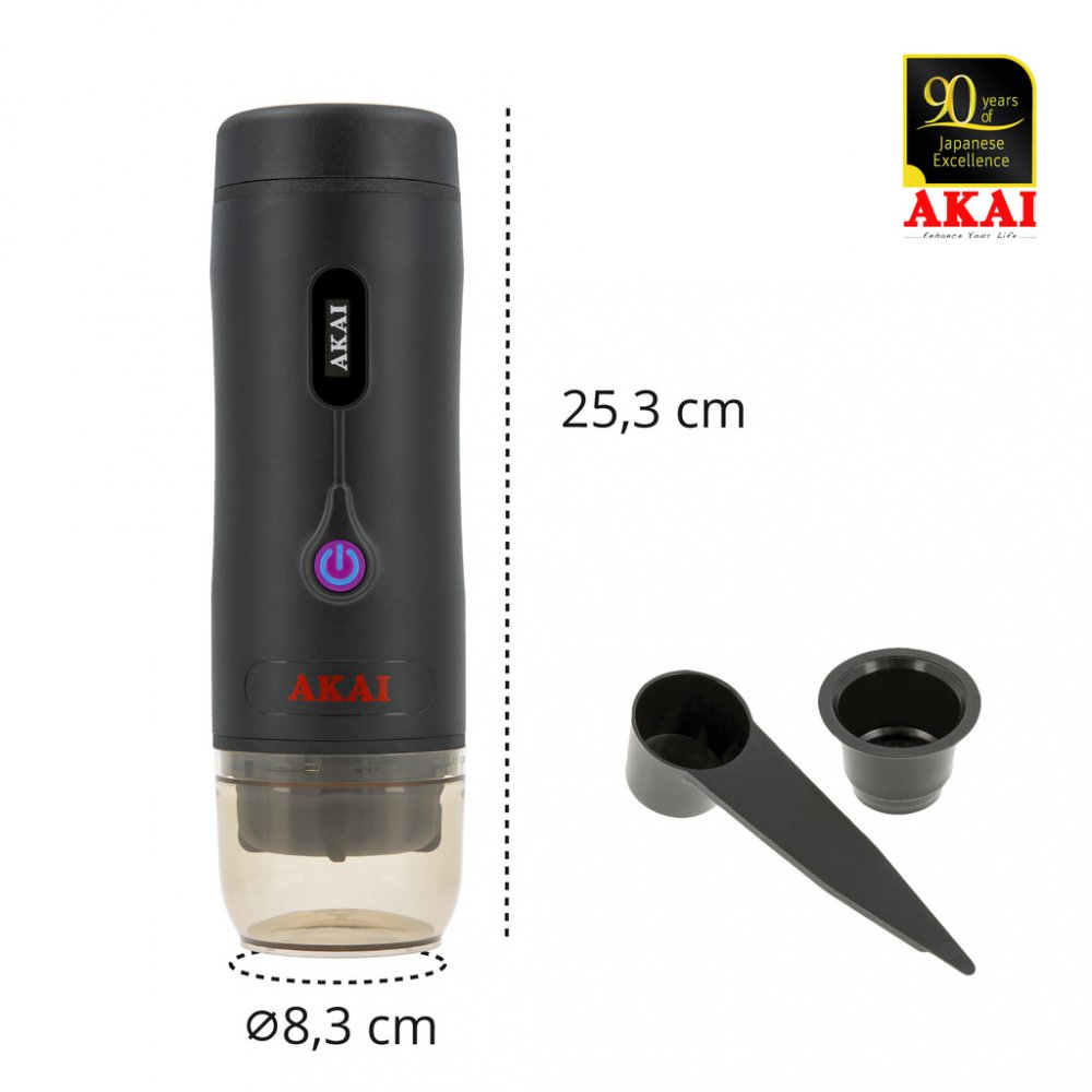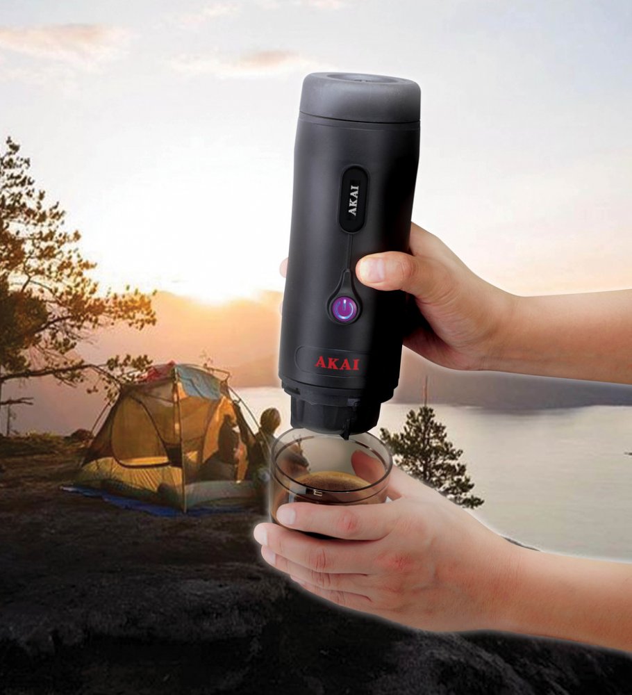 AKAI espresso je první a jediný bezdrátový přenosný espresso kávovar, který má energeticky efektivní vaření vody, které je napájeno odnímatelnou lithiovou baterií navrženou na míru, pracuje stisknutím jednoho tlačítka a automaticky pumpuje a nalévá vaše espresso přímo do odnímatelného, bez BPA a průhledného šálku (Tritan).