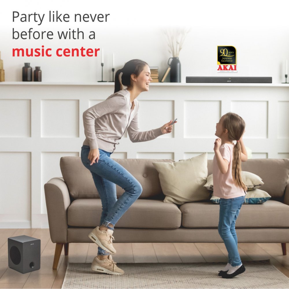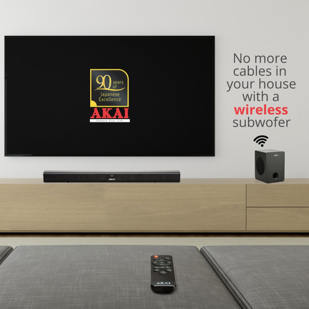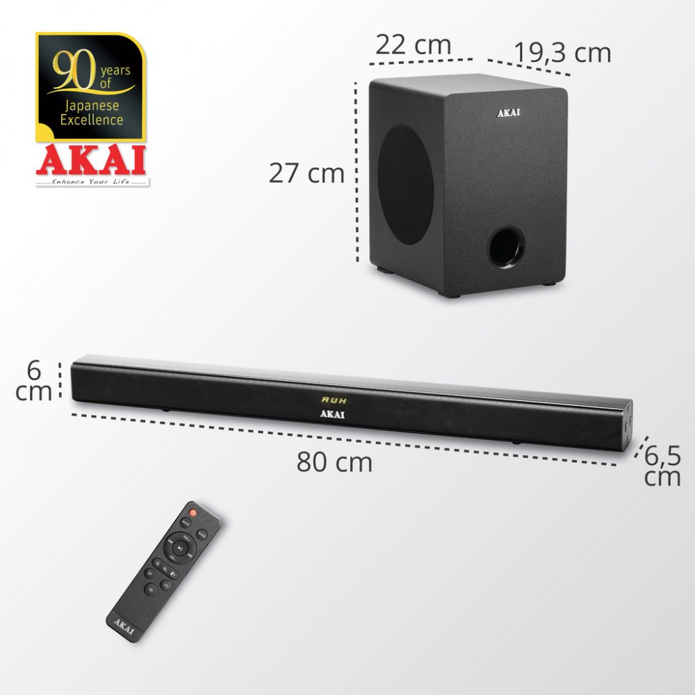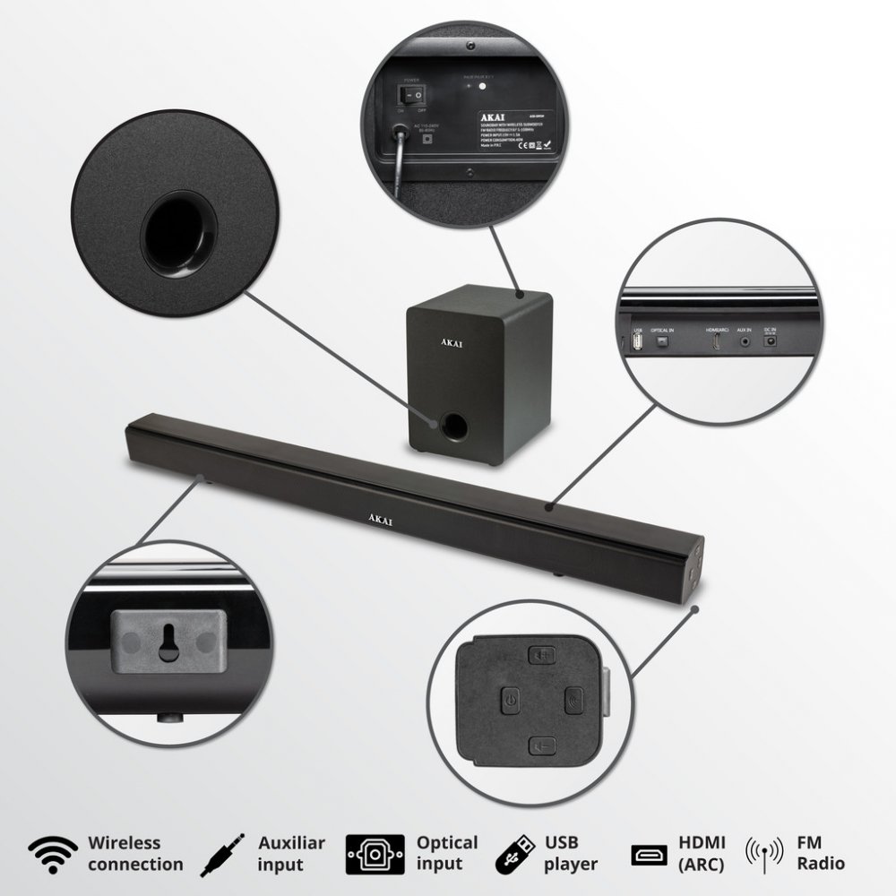Soundbar AKAI má zvuk, který vám zpříjemní hraní her, sledování filmů nebo poslech hudby a dodá vám pocit, že jste součástí hry nebo filmu. Díky výkonu 70 W a 2.1kanálovému provedení si vychutnáte nejen křišťálově čistý zvuk. O výrazné a čisté basy se postará výkonný aktivní bezdrátový subwoofer. Bluetooth 5.0, USB, HDMI, optika a AUX zajišťují rychlé a pohodlné připojení k další elektronice. Vestavěné FM rádio pak nabízí další možnosti poslechu hudby. Automatické vyhledávání zabere méně než minutu a vy můžete poslouchat své oblíbené kanály. Pohodlné ovládání odkudkoli zajistí dálkový ovladač. Třešničkou na dortu je přehledný displej, který zobrazuje potřebné informace. Vlastnosti: - Vhodný pro přehrávání hudby, videa a videa z internetu: - 2.1 soundbar - zvukový výkon: 70 W RMS - výkon reproduktorů: 4 x 2" 10 W jednotky a 2 x jednotky s basovou membránou + 1 x 5,25" 30 W jednotka subwooferu - verze Bluetooth: 5.0 - dosah Bluetooth: až 10 m - rádio FM : 87,5 MHz-108 MHz - připojení: USB, OPTICAL, HDMI (ARC), AUX (3,5 mm), DC IN - napájení: 19V 1,5A - LED displej - dálkové ovládání- Rozměry soundbaru: 6,5 × 80 × 6 cm (v × š × h) - Subwoofer - rozměry: 19,3 × 22 × 27 cm (v × š × h)