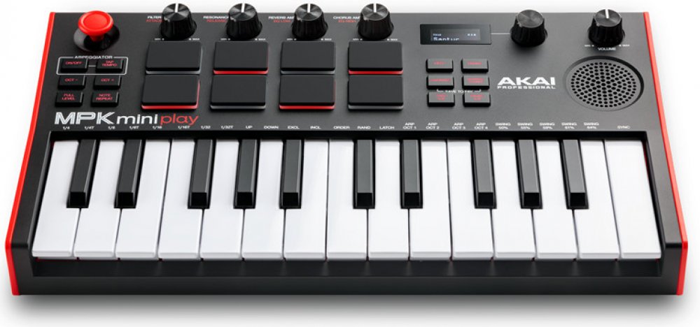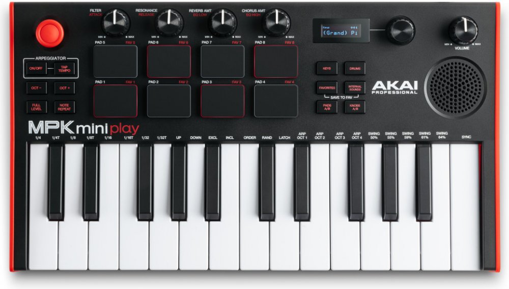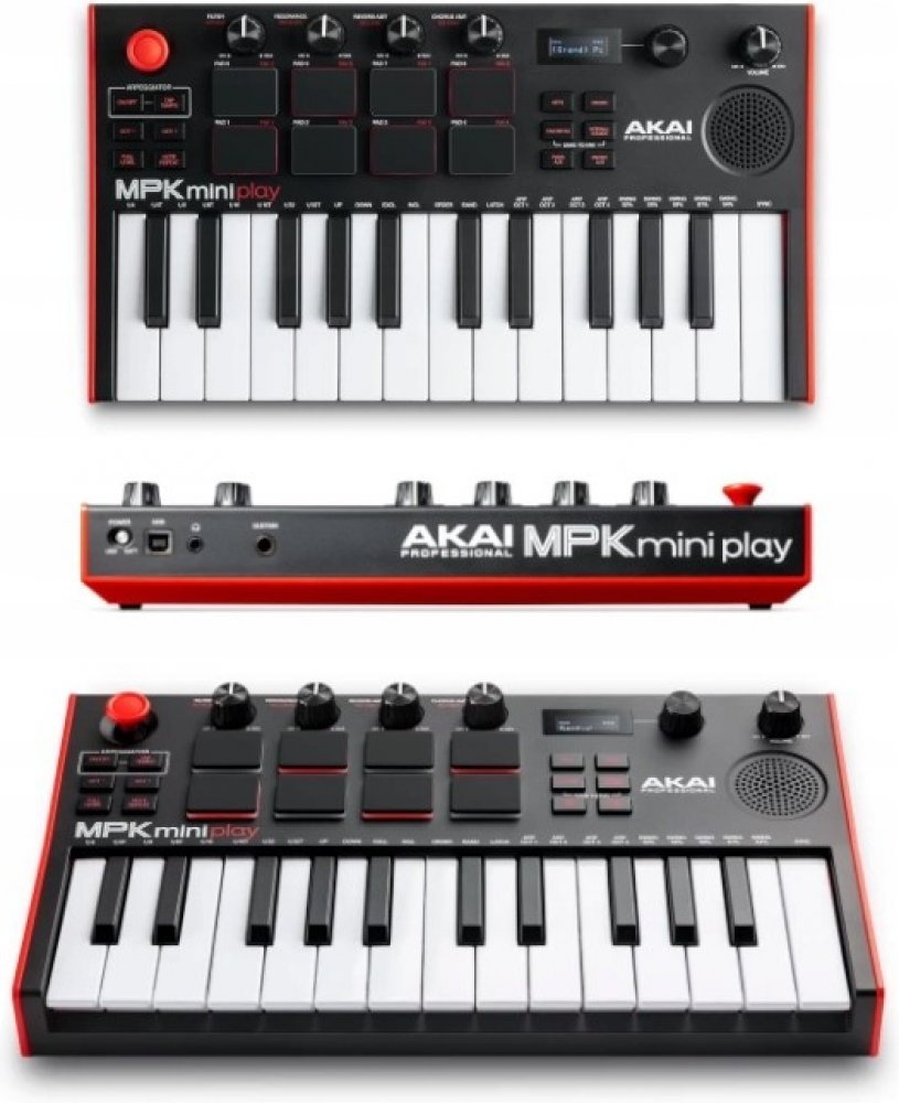Akai MPK Mini Play MKIII je třetí generace nejprodávanějšího MIDI keyboardu na trhu, která kromě mini klaviatury nabízí MPC pady, otočné ovladače, nebo arpeggiator. Samozřejmostí je také silná softwarová výbava. Play je navíc samostatně hrající nástroj, který funguje i bez připojení k PC a DAW softwaru. Obsahuje 128 nástrojů, 10 bicích sad, integrovaný reproduktor, OLED displej, sluchátkový výstup a možnost napájení prostřednictvím tří AA baterií.
