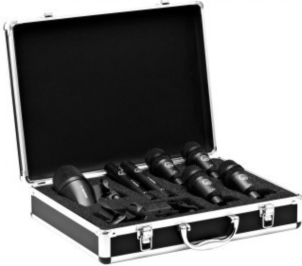 AKG Drumset Session I - sada mikrofonů pro snímání bicí soupravy, vhodná pro studiové i live použití. Sada obsahuje 4x P4 dynamické kardioidní mikrofony pro tom/snare s držáky H440, 1x P2 dynamický kardioidní mikrofon pro snímání basového bubnu a 2x P17 kondenzátorové kardioidní overhead mikrofony s držáky. Součástí je také pevný hliníkový přepravní kufr. AKG P2 - je dynamický mikrofon určený pro snímání basového bubnu, baskytarových aparátů, trombonů a jiných nástrojů podobného charakteru. Jeho zv