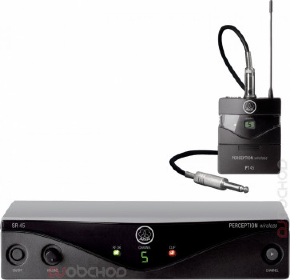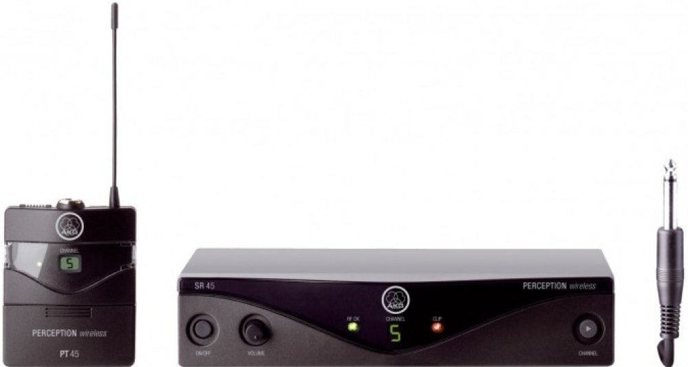 AKG WMS45 Instrument set (SR45, PT45, MKG L) je bezdrátový set určený pro elektrickou basu, baskytaru a další nástroje. Jeho výraznou předností je velmi malý a lehký bodypack vysílač a kompatibilita s mikrofonní řadou AKG MicroMics. Součástí setu AKG Perception Wireless Instrumental Set je přijímač AKG SR45 a bodypack AKG PT45. Přijímač má na svém šasí minimum ovládacích prvků, přesto není nastavování parametrů nijak ochuzeno. K ovládání slouží potenciometr Volume, tlačítko Channel pro přepínání kanálů, LED displej zobrazující zvolený kanál, LED indikátory signálu a clippingu, vypínač a trimr pro nastavení squelche. Výstupy jsou osazeny XLR a ¼“ Jack konektory. Bodypack PT45 je vůbec nejmenším a nejlehčím vysílačem ve své třídě a kromě toho je kompatibilní s miniaturními mikrofony AKG MicroMics, které umožňují kvalitní ozvučení všech běžných nástrojů. PT45 je vybaven displejem, LED indikátorem stavu baterie a vypínačem, pod krytkou baterie najdeme přepínač kanálů a trimr pro nastavení vstupní úrovně. Bodypack je napájen jednou AA baterií, na níž dosahuje životnosti až 10 hodin.