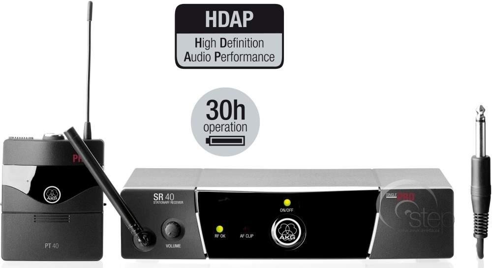 Kytarový/baskytarový bezdrátový set AKG Perception Wireless Instrumental Set je bezdrátový set určený pro elektrickou basu, baskytaru a další nástroje. Jeho výraznou předností je velmi malý a lehký bodypack vysílač a kompatibilita s mikrofonní řadou AKG MicroMics. Součástí setu AKG Perception Wireless Instrumental Set je přijímač AKG SR45 a bodypack AKG PT45. Přijímač má na svém šasí minimum ovlád...