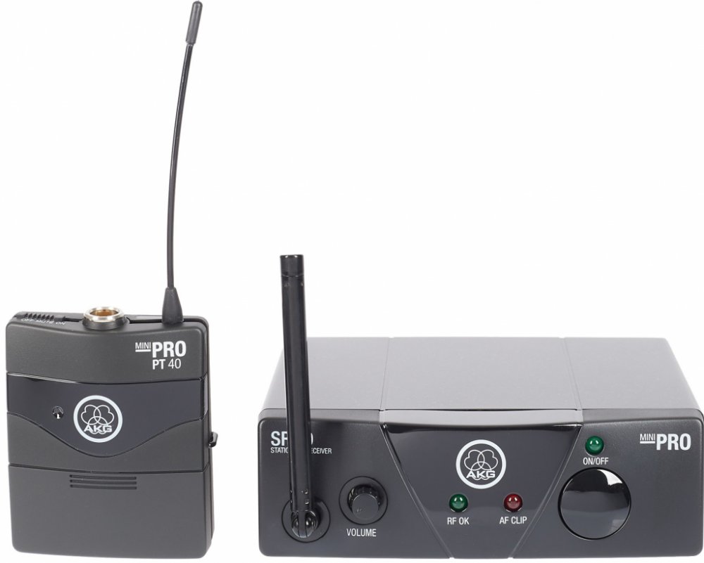 Kapesní bezdrátový systém ze série WMS40, který je skutečným "plug'n'play" bezdrátovým řešením a poskytuje křišťálově čistý zvuk. Je připraven k použití během jedné sekundy a operuje na frekvenci 661,100 MHz, poskytujíc optimální řešení pro malé pódia, kluby, menší bohoslužby, hotely a posilovny. Systém zahrnuje stacionární přijímač SR40 Mini, kapesní vysílač PT40 Mini a nástrojový kabel MKG L s mini XLR a 6,3 mm konektorem. Přijímač je vybaven třemi stavovými LEDkami indikujícími stav zapnutí/vypnutí, intenzitu přijatého signálu (RF OK) a zvukové oříznutí (AF CLIP). Poskytuje ovladač hlasitosti a bezhlučný vypínač pro ochranu připojených reproduktorů, stejně jako jeden vyvážený výstup přes 6,3mm konektor. Dodávaný napájecí zdroj se spínacím režimem pracuje na libovolném střídavém napětí od 110 do 240VAC a je vybaven adaptéry pro použití v EU, Velké Británii a Spojených státech. Kapesní vysílač je vybaven profesionálním mini XLR audio konektorem, který umožňuje propojení s různými kytarami, baskytara, nástrojovými snímači či headsety. Nabízí také ovladač zesílení pro přesné nastavení hlasitosti vstupního signálu a nehlučný vypínač on/off/mute zvuku. Skvělou funkcí vysílače je mimořádně dlouhá životnost baterie, zaručující až 30 hodin operačního času při použití jedné AA baterie.
