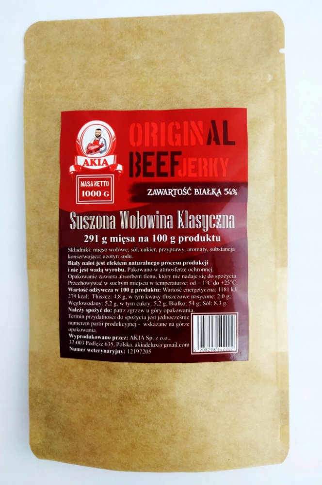 HOVĚZÍ JERKY,Sušené klasické hovězí maso XXL MEGA PAKA 1000 g !!!Vážení,Jsme polským výrobcem sušeného masa a lahůdek z polské hovězího a vepřového masa.V naší nabídce najdete vysoce kvalitní, ručně vyráběné výrobky.Naše vysoce bílkovinné svačinky vám zajistí velkou dávku energie a spokojenosti.