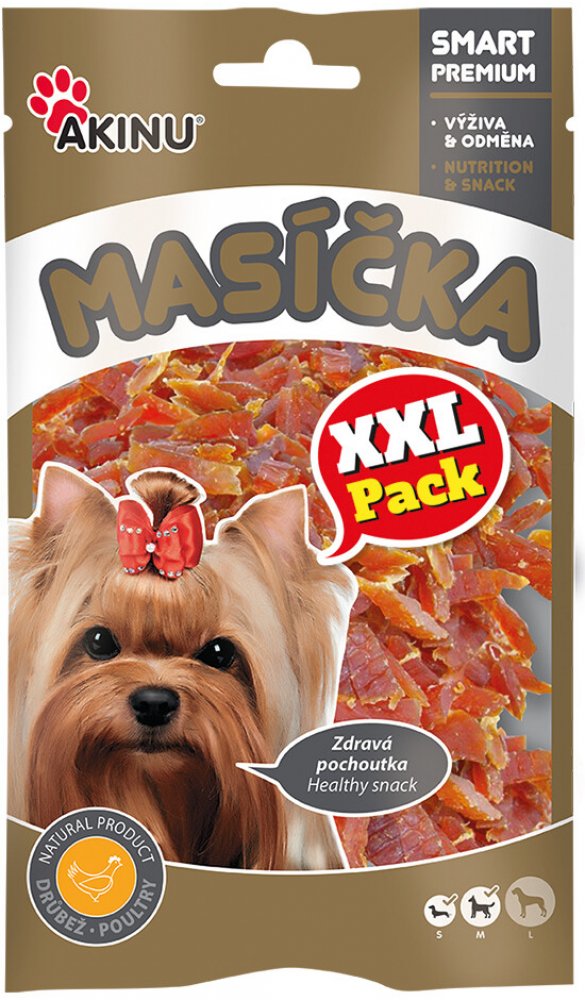 Chcete svému psímu parťákovi udělat radost extra chutnou, voňavou a navíc dietní dobrotou? Vsaďte na Akinu kuřecí proužky! Extra chutná pochoutka z kuřecího masa: Akinu kuřecí proužky pro psy Kuřecí maso obsahuje minimum tuků, a tak je vhodné i pro pejsky, kteří musí dodržovat dietu. Šetrná technologie zpracování uchovává přirozené výživné látky. Akinu Masíčka kuřecí proužky pro psy XXL - vhodné při dietě - chutné a neodolatelně voňavé - uzavíratelný obal, který chrání kousky před osycháním Vhodné pro: psy menších a středních plemen od 4 měsíců věku Velikost balení: 90 g Víte, že: v nabídce najdete také výhodné 300g balení kuřecích proužků pro psy? Nákupem tohoto výrobku máte zaručeno, že kupujete výrobek přímo od výhradního distributora v Česku a zahraničí.Nakupujte i další výrobky od značky AKINU a ušetříteza dopravu.