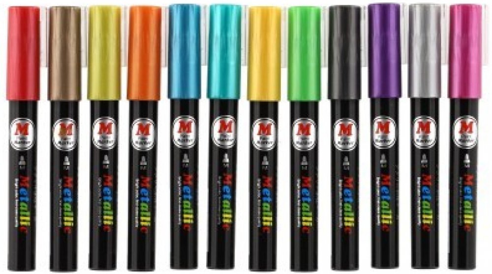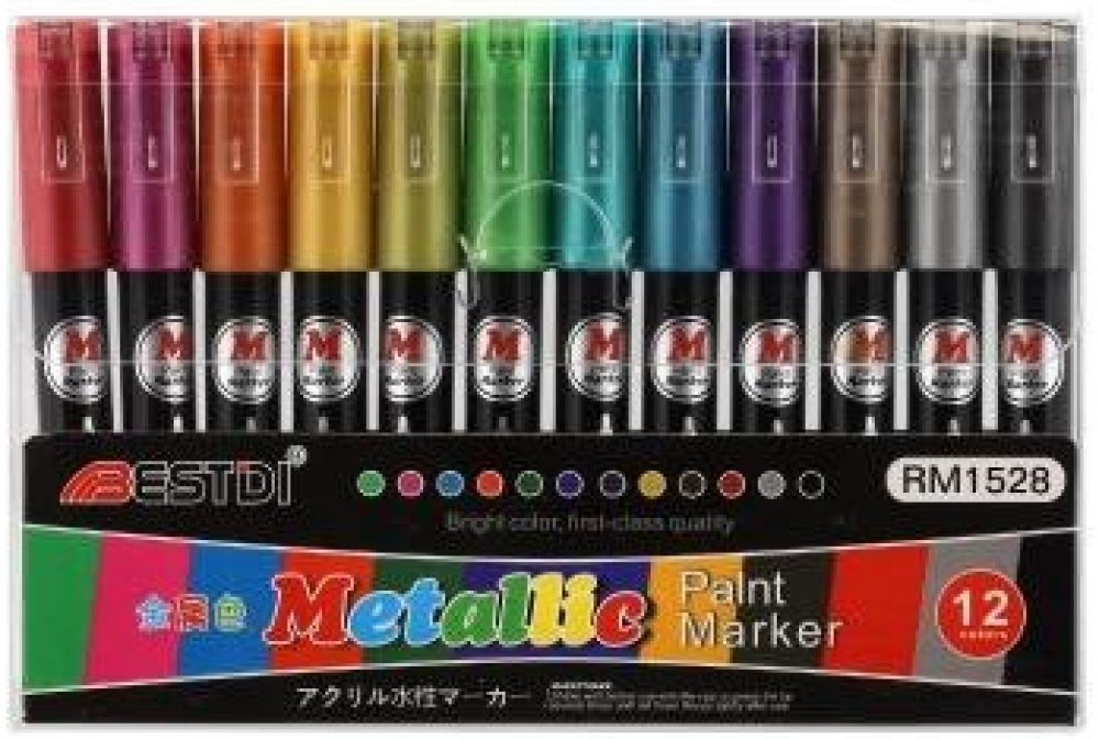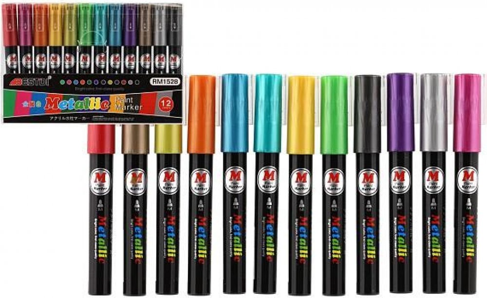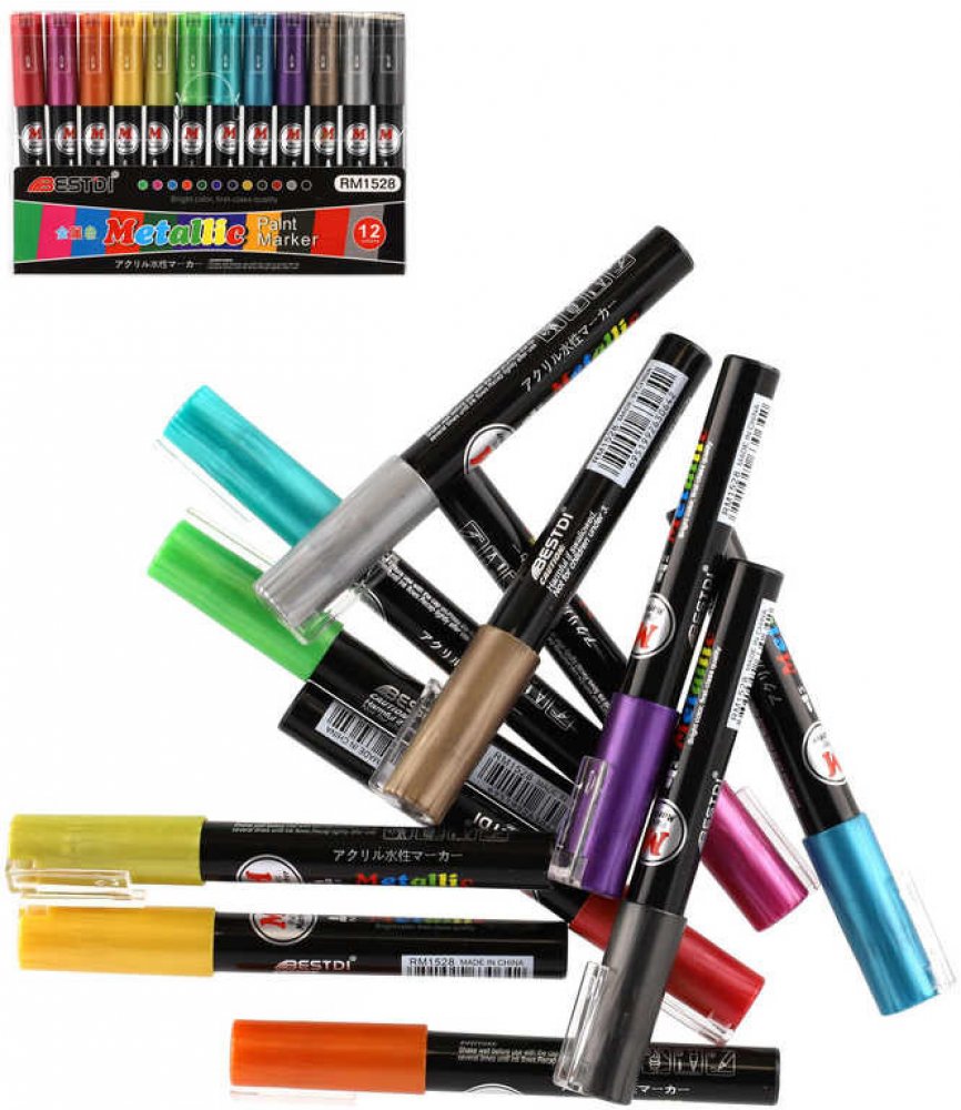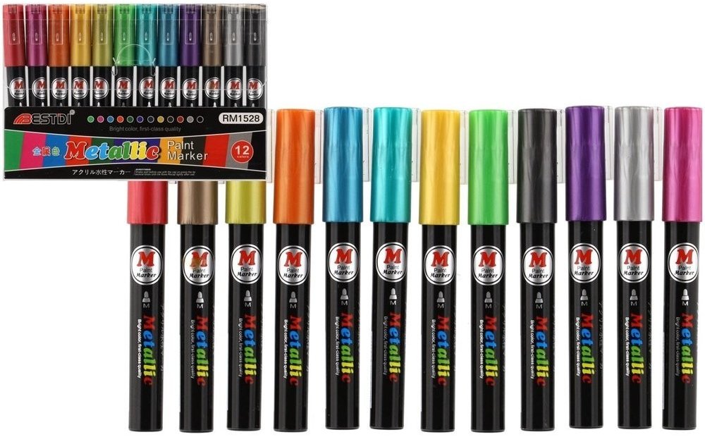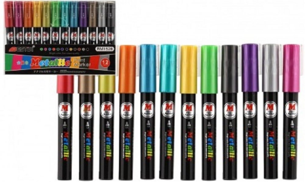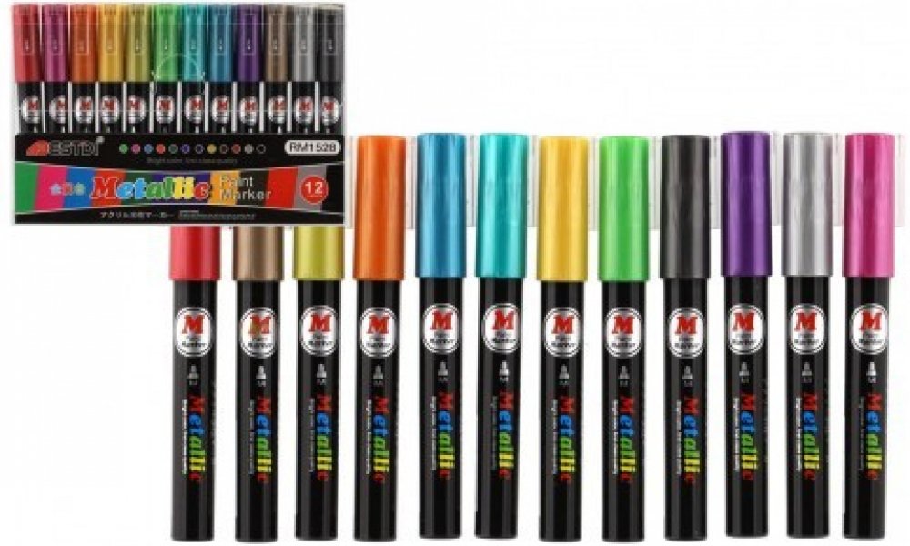 Metalické dekorační akrylové popisovače vhodné na jakýkoli materiál, například kámen, keramiku, sklo, plátno, kov či plast a další. Rychle schnou a po zaschnutí jsou fixy voděodolné. V balení je celkem 12 různých barev, šířka hrotu je cca 4 mm.